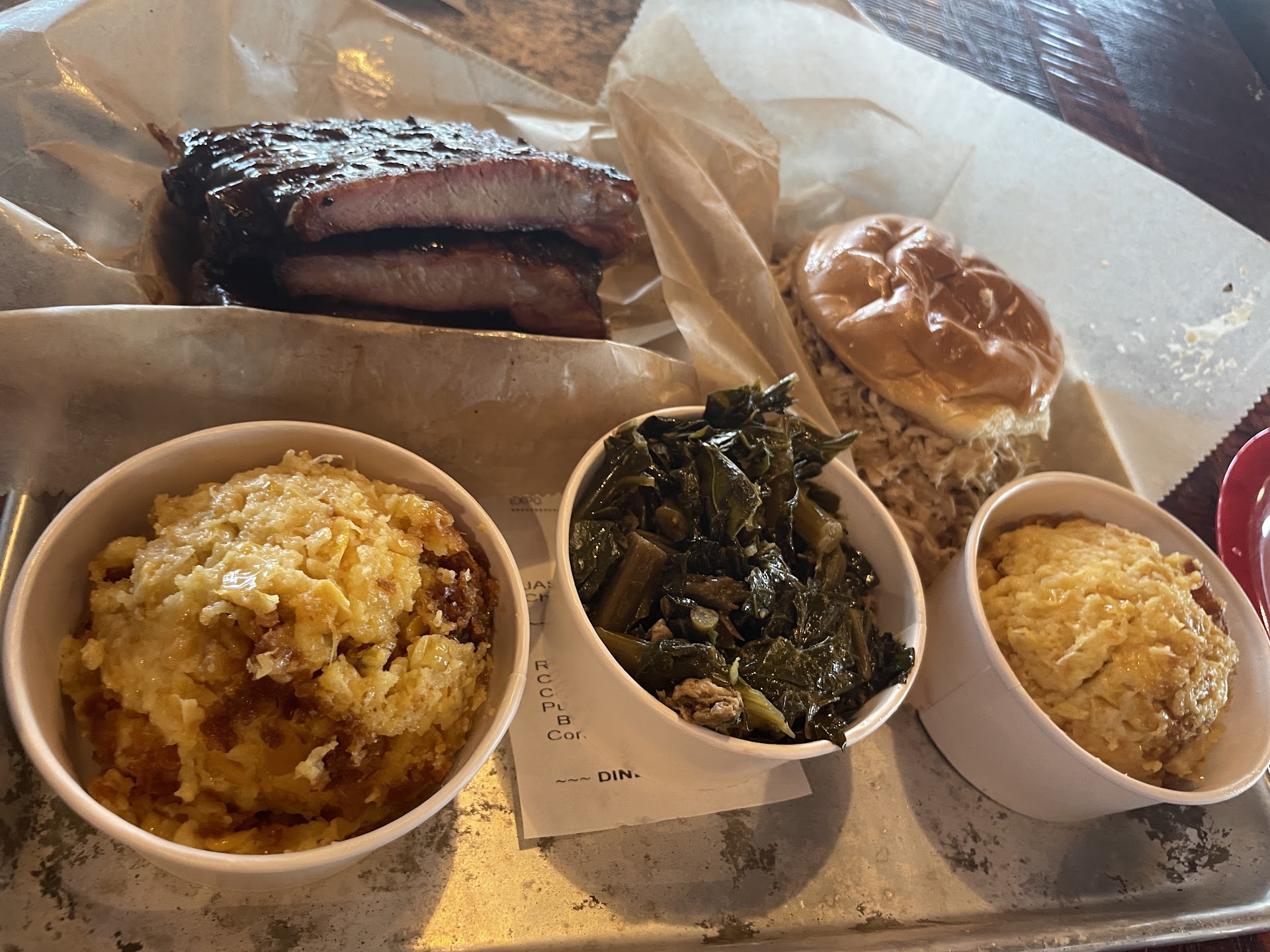 With easy parking and even a drive-thru available, I walked in and was greeted with smiles immediately. You can see the LED menu and a full staff working behind the counter in different stations. After carefully searching the menu and asking plenty of questions, I decided on ribs, collard greens, corn pudding, and a pulled chicken sandwich.