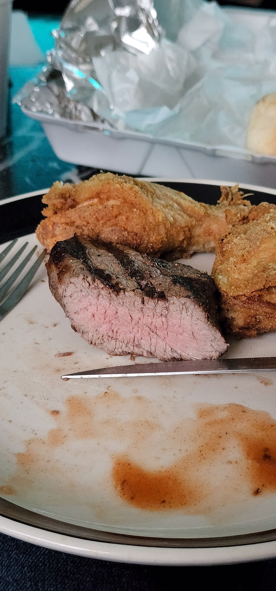 The third and most recent steak was surprisingly medium with some pink in the dead center (see pic); however, as always with eating any sirloin steak cooked longer than medium-rare, the outer edges were like eating a boot.