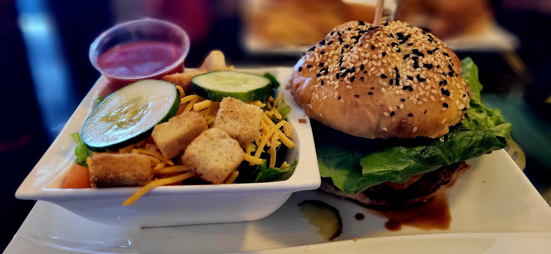 We started off with the fried pickle appetizer, of course, which we demolished, I apologize for the lack of photo on that. You'll have to take my word on it, this is really worth coming for! That batter is amazing. I ordered the busted Al Capone burger, spiced with a side salad with raspberry vinaigrette on the side. The burger came out and was quite large, I had to cut it in half and take the other half home to be quite honest. I do warn you, its a very messy burger, eat with caution. They toasted the bun perfectly, and the ratio of bun to meat was on point. The salad was a nice sized side salad for only a very small extra fee, which I thought was nice.