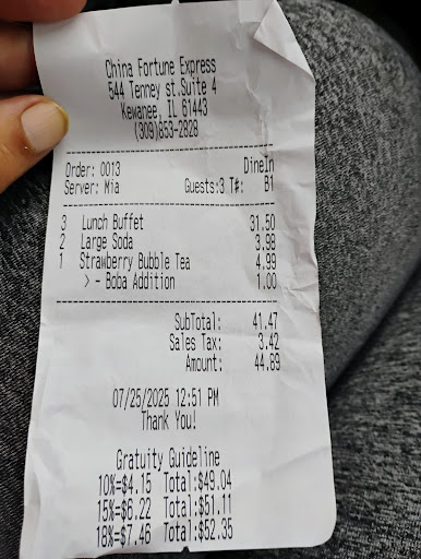 I come from Texas, so this place really shocked me for being a buffet style restaurant. The place was rather small. There is no real feel of being authentic. The buffet was what really got me. All the food I got tasted bland. No salt. No kind of flavors or seasonings to be had. I'm not sure if it's just an Illinois thing because I run into this a lot at restaurants. Lomein noodles were made from spaghetti. Also No real flavoring or typical veggies that go into lomein noodles. Sweet and sour chicken were not edible. Too soggy chicken and again no flavoring in the sweet and sour sauce. The prices were really cheap. 35.00 for 3 buffets and 2 soft drinks. Waitress kept drinks full, but again, no type of personal interactions. This, in my own opinion, is not the type of restaurant I would say "They were so good I have...