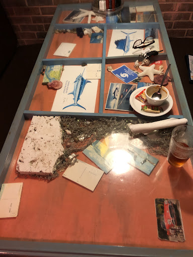 The kitschy and eclectic design was everything you’d hope for from a small island diner: a hand blown glass Octopus chandelier, nautical themed fishing equipment, ceiling panels that resembled the open sky, palm trees, seashells, fish window decals, license plate lamp covers and an oversized bar, surrounded in bar stools, anchored in the center of the restaurant. Even the shell themed bathroom sink and pirate’s themed wall hanging in the hall added to the overall appeal.
