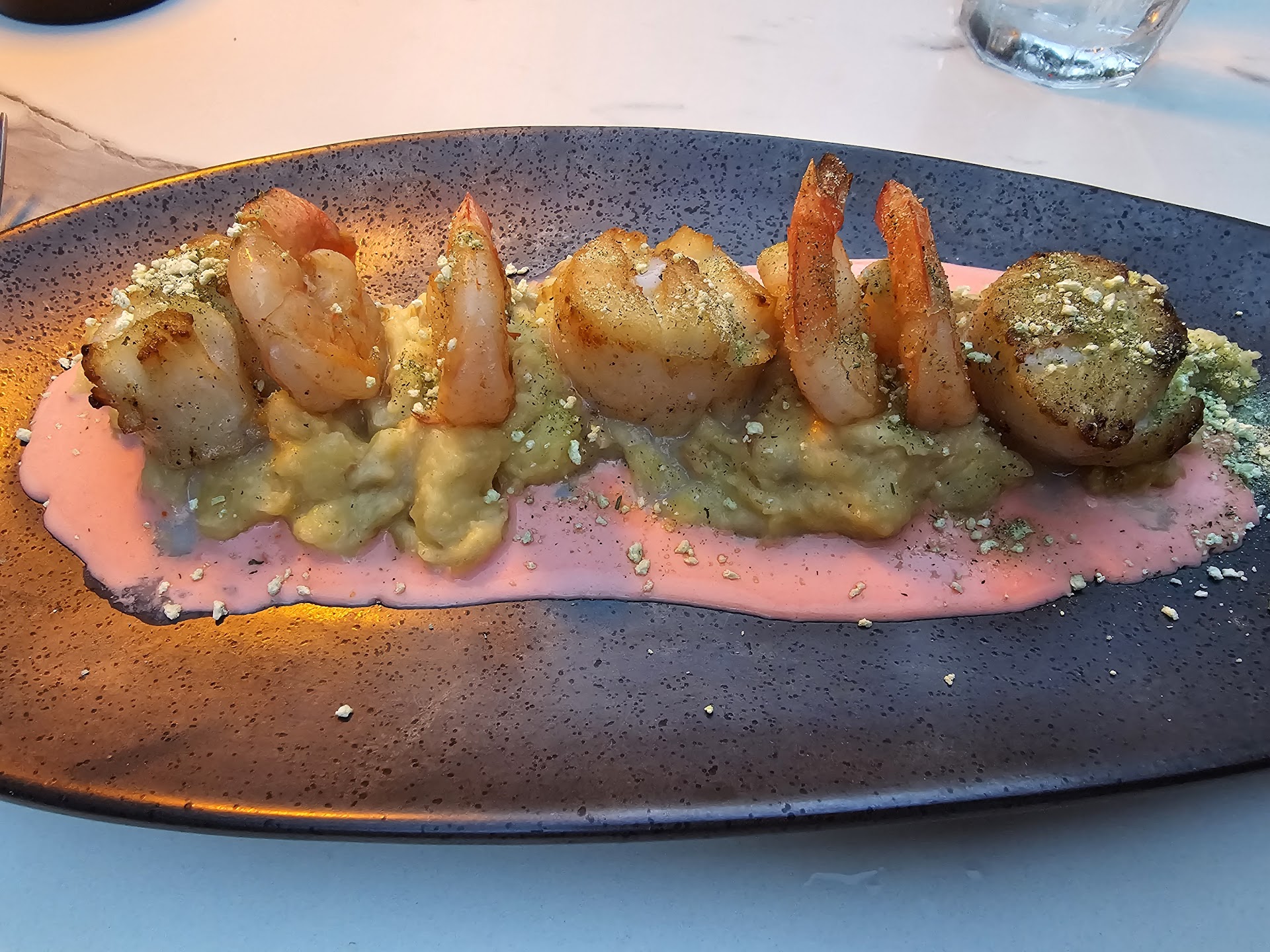 The scallops and shrimp were not as good as I had hoped for. The shrimp had tails on, if I'm paying $50 for a dish I expect to do no work to prep it for consumption. The shrimp were over cooked making them tough. The scallops were done nicely, however they had little flavor or seasoning. The cauliflower pancetta mash was good; however, it wasn't quite the right pairing for this dish. It was like mashed potatoes with shrimp. How often do you eat seafood with mashed taters?
