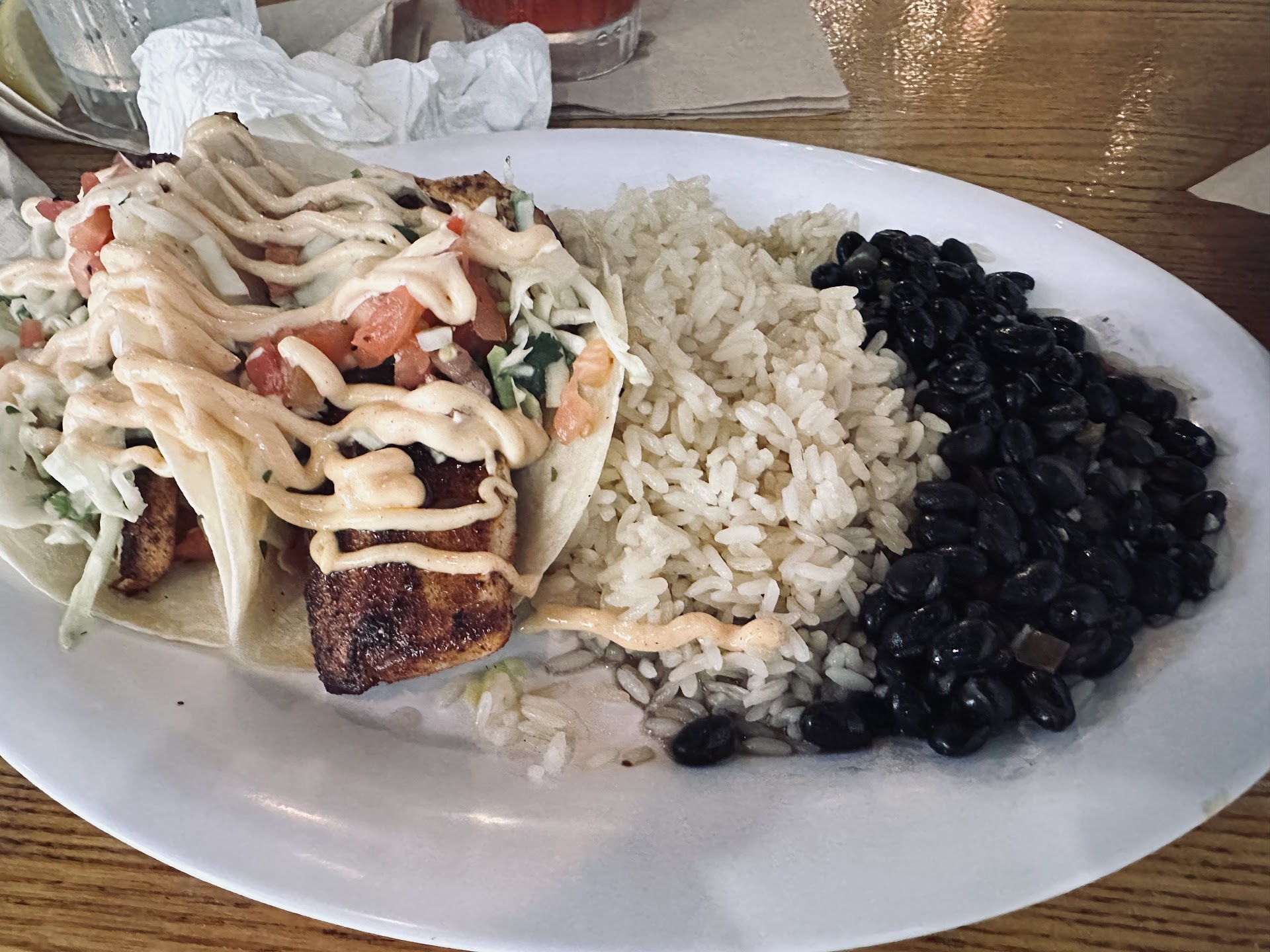 Moving on to the Fish Tacos, as you can see, the Mahi-Mahi was blackened as requested, the sauce is artistically applied, and the rice and beans look wonderful. However, as is often the case in life, looks are deceiving. I don't want this to be a casus belli on my page, but if they had higher-quality ingredients with this cook, these would be off the charts. As it was, they were average at best.