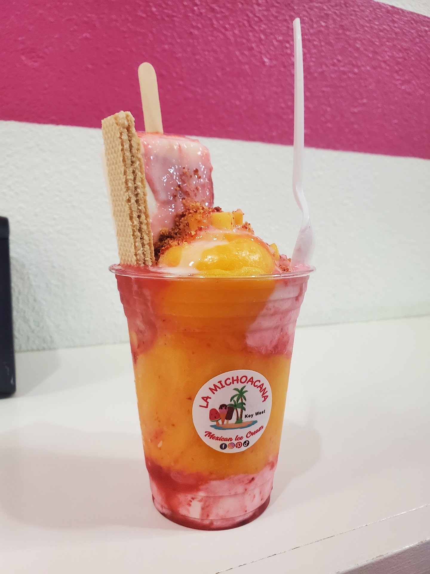 A do-not-miss experience. Easy parking in Searstown plaza away from Key West crowds -- located conveniently on the drive in or out of Key West, La Michoacana is not anything like your standard, American ice cream shop. Not much on looks, but wowwie! It's like walking into a tropical taste treat of fruity and creamy ice creams and rich sorbet-like flavors made with yummy, fresh fruits, cream, and more. Innovative combos. We loved the Hot Banana -- a sundae with vanilla ice cream, warm caramelized cooked-banana sauce with real banana pieces supplemented by fresh banana slices. Also the more exotic, huge cup of mango sorbet combined with strawberries-and-cream ice cream. Not Baskin Robbins typical strawberry but thick streaks of real, deep red strawberry puree in an unusual, delicious vanilla ice cream topped with small cubes of real mango and I'm not sure what else, but it was super yummy. We didn't get to try the spectacular "popcicles" (shaped more like ice cream bars on sticks). They belong in a modern art museum. Exotic flavors, some embedded with big fruit cross sections. There are ice cream, dairy-free flavors, and huge shave-ice type snow cones drenched in creamy or fruity sauces. If savory is on your menu, the shop also has a few mini-meal treats -- large cups of a saucy Mexican street corn concoction, a flat-bread/pizza-type slice piled with some wild toppings, and more. Think Haagan Dazs does Acapulco at the corner of Mexico City and Sears...