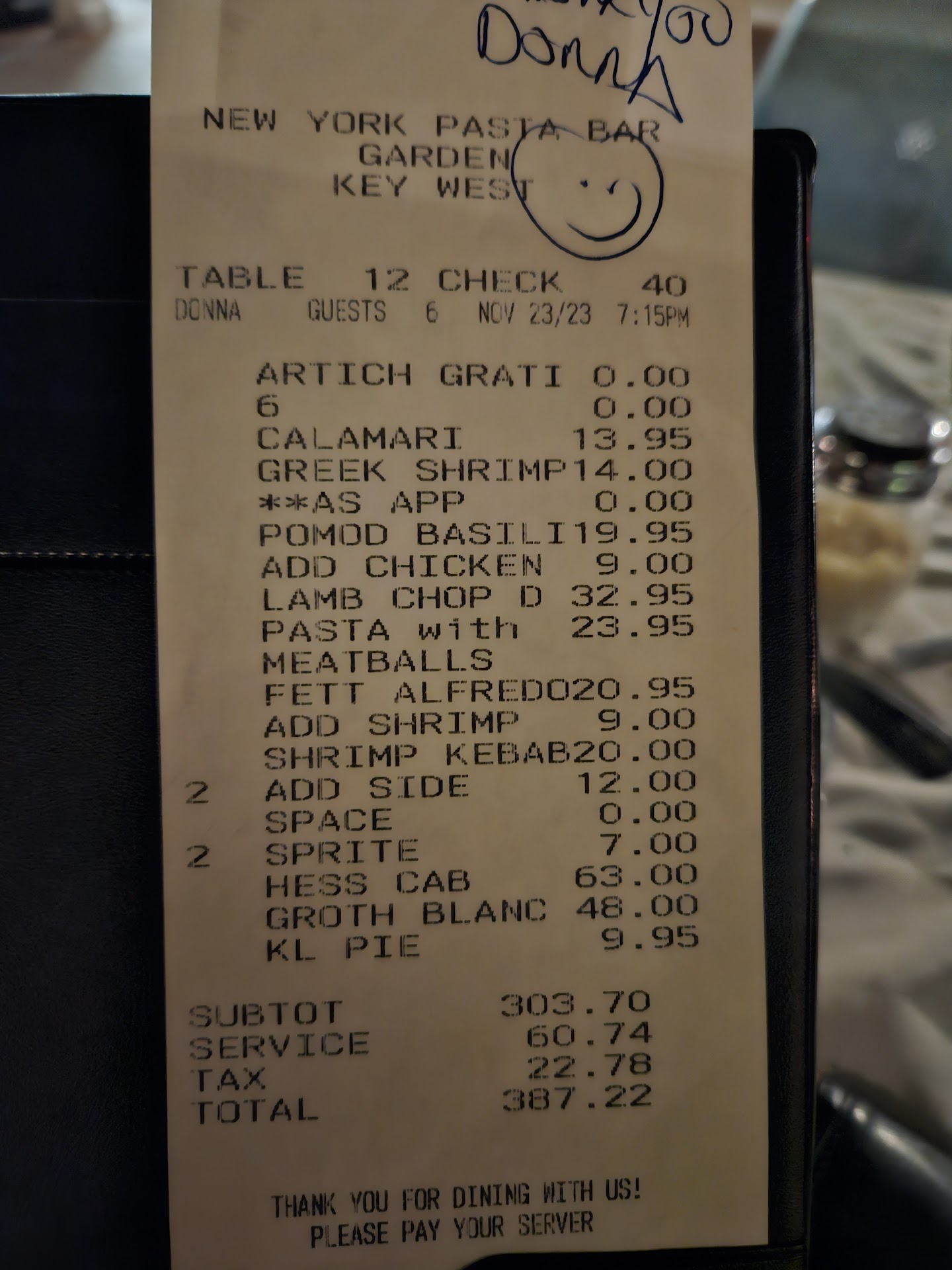 Read moreIf just rating the food this place would be at least 4 stars. However, we left with a feeling the sever was trying to put one over on some witless tourists. Thankfully my wife saw the bill as I was paying and remarked it looked a little high. I had only looked at the food and did not notice an additional $60 "Service Charge" under the tax section. Donna, our server, made no mention of this when she brought it to me. When she came back I asked her if she had automatically included gratuity. The only way I can describe her reaction was "odd". She mumbbled something like, "Oh, ya service charge" I know some restaurants, especially those with a lot of foreign customers, automatically include the tip. However, I did not see this posted anywhere and Donna certainly did not bring this to our attention. Nowhere else we dined in the Keys had this practice. I was ready to tip on top of this and would have done so if my wife hadn't noticed! Afterwards I also noticed Donna had entered number of guests as 6 (top of the receipt). There were only five of us. Maybe 6 triggers automatic 20% tip? At the end of the day we would have left 20% or more as we commonly do. This whole thing just left me with a bad taste in my mouth after what was a very...