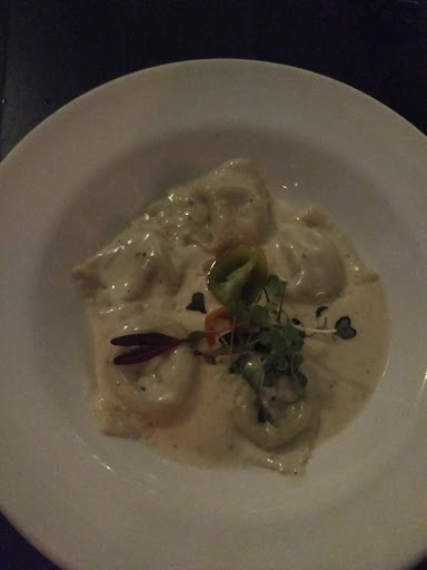 so we went upstairs where they said we could wait for a seat the cocktails were good the staff was nice so we ordered some apps (very small - very expensive apps) Bobbie ordered a Salad.... Later a rather small arugula salad came out with some grated (instead of shaved) pecorino on the top. Later -a small half of cup of pink shrimp corn chowder came out it was tasty but had an odd (very odd) aftertaste. (Maybe old shrimp go to die in the chowder)