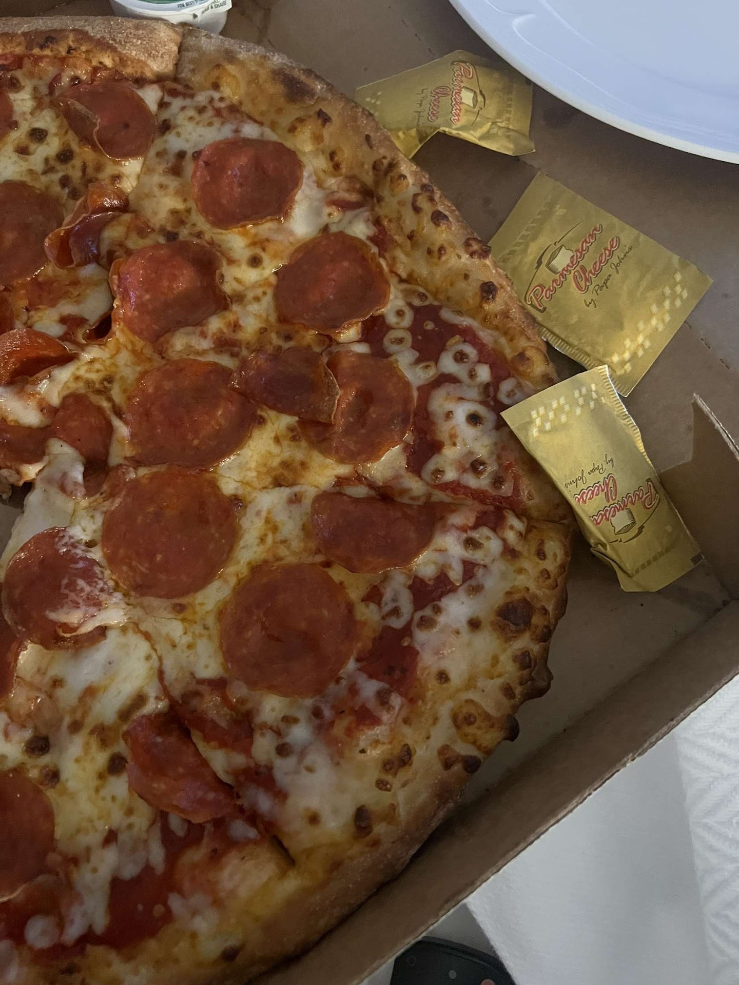 We ordered pizza during a thunderstorm to our hotel. The person on the phone didn’t even know what a Parmesan crust was, argued with me for minutes, then finally said it was “only on a large.” Fine — I ordered a large and a medium, asked for plates, napkins, and confirmed payment with the driver. I was told “pay when he gets there.”