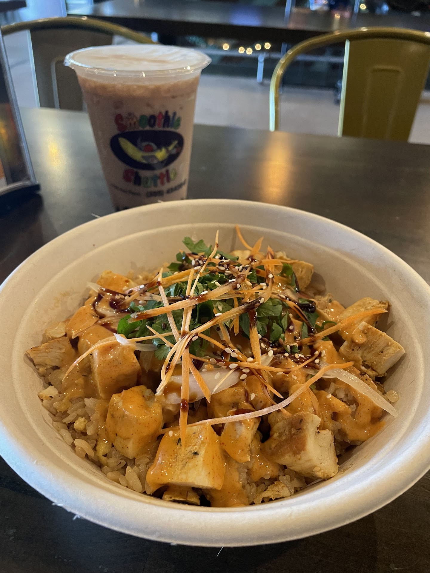 Great service and never full; you can always expect to order quick and easy, in a span of 10 minutes. If you plan on dining in, there will always be seats available, especially during lunch rushes. Their boba teas are wonderful; I personally recommend their Peach Milk Tea with Tapioca Pearls. It's on the sweet side, so be mindful of that. I also ordered their grilled chicken bowl and it was amazing. It's a great lunch portion, and is very enjoyable with YumYum sauce. Plan for about a 10 minute wait. Staff is very helpful in helping you choose if you feel overwhelmed...
