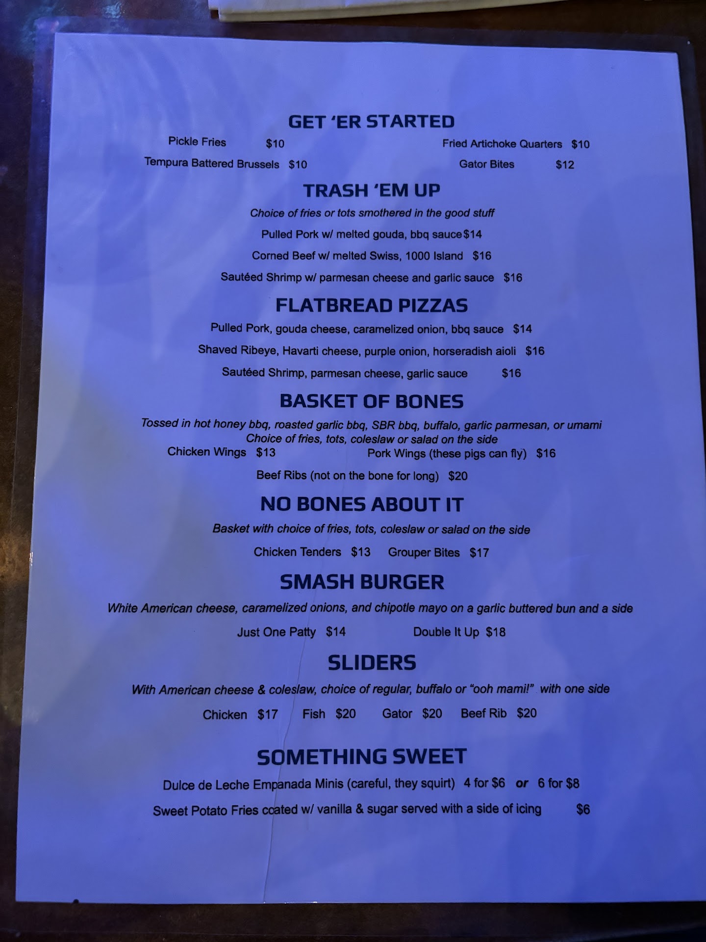 Read moreNewest late night spot in Key West... Surly Siren Salloon - A friend of mine dragged me there last week, for some great live music... they had only been open a couple weeks, taking over the old Rooftop restaurant - The second floor corner of Fitzgerald and Front Street, across from Mallory Square and off Duval FEATURING: LIVE LOCAL MUSIC! "This place was phenomenal, the Bar food was off the charts, and they keep their kitchen open till 2:00 in the morning course they have a great Smashburger... but being from Florida, I've never had Alligator before, and the Alligator ribs... tastes just like chicken, All the Flavors of "Trashed Tots" were awsome , Flatbread Pizza - awesome, Pig Wings, Chicken Wings, Deep Fried Pickles, Fried Brocoli, Fried Artichokes? OH My! then there was the "Fred Flintstone style Brontisorus" beef ribs and they were most excellent! YAAABBA DABB A DO!