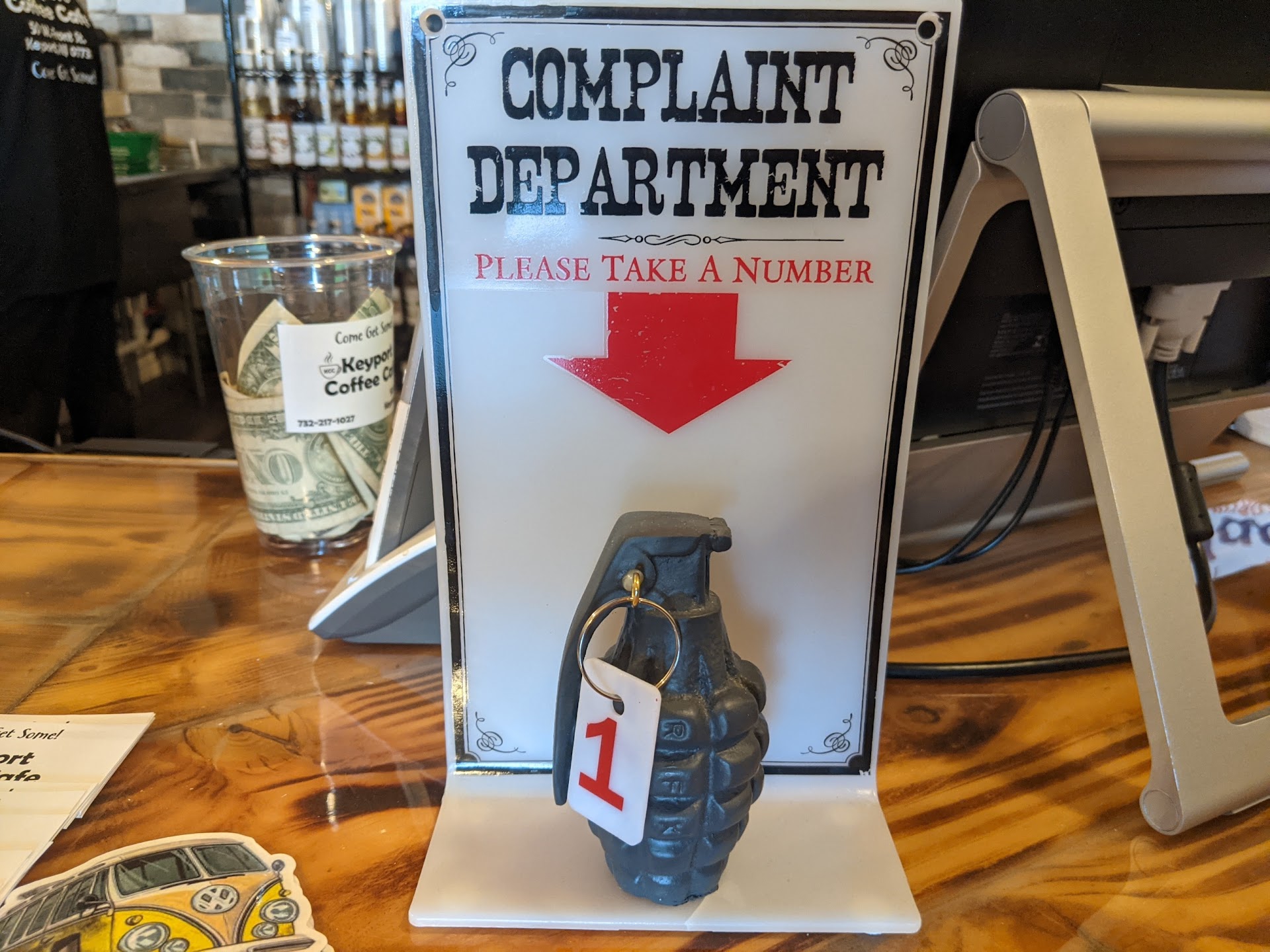 On the positive side, the service was excellent. The people behind the counter were very helpful/accommodating, and just super personable. My chum loved their complaint department joke display at the counter, which resulted in a conversation about its back story (and her insisting that I take a picture of it - enjoy). Very nice people, and because of that, I'd be willing to come back at a different time of day to try something else. The intangibles are...