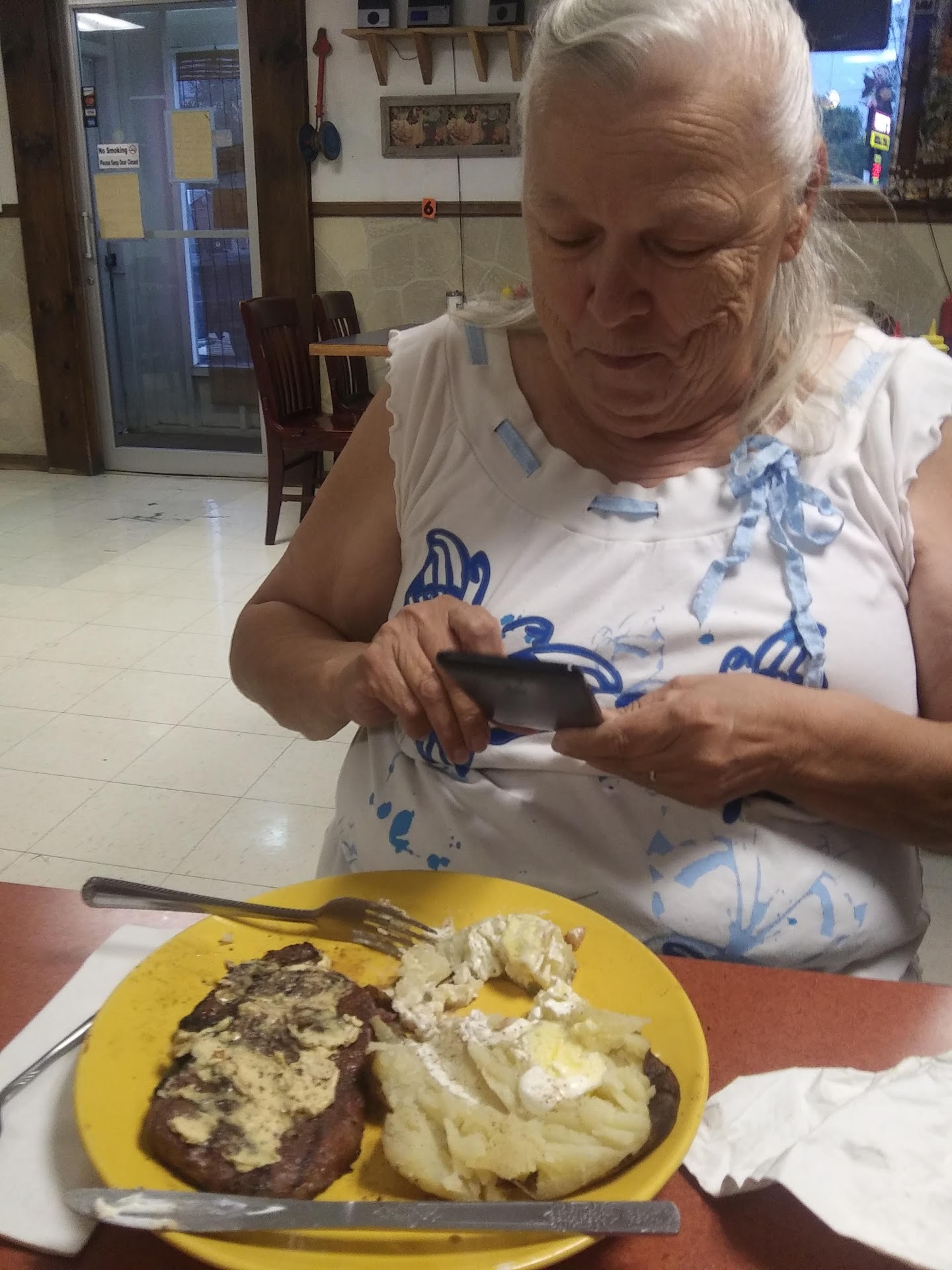 If you’d like to have hometown cooking like I do, and eating with the locals, this is the place for you. My traveling companion and I stopped in for lunch and we had the broasted chicken special. It came with mashed potatoes and milk gravy, corn, and a hot dinner roll. The meal came with a bowl of chocolate pudding for dessert. My broasted chicken breast and wing were tender and juicy and very tasty and when I ask my companion, she stated that her chicken leg and thigh were also very good. Looking at the menu there’s a wide variety range from hamburgers, open-faced roast beef, to tenderloins that hang off the plate from what I saw arriving at the table next to us. Homemade pies include apple, pecan, peach, coconut cream, chocolate, blackberry, gooseberry, and rhubarb. It’s real hometown cooking and a the place is packed at lunchtime. There’s seven tables and three booths,and it’s...