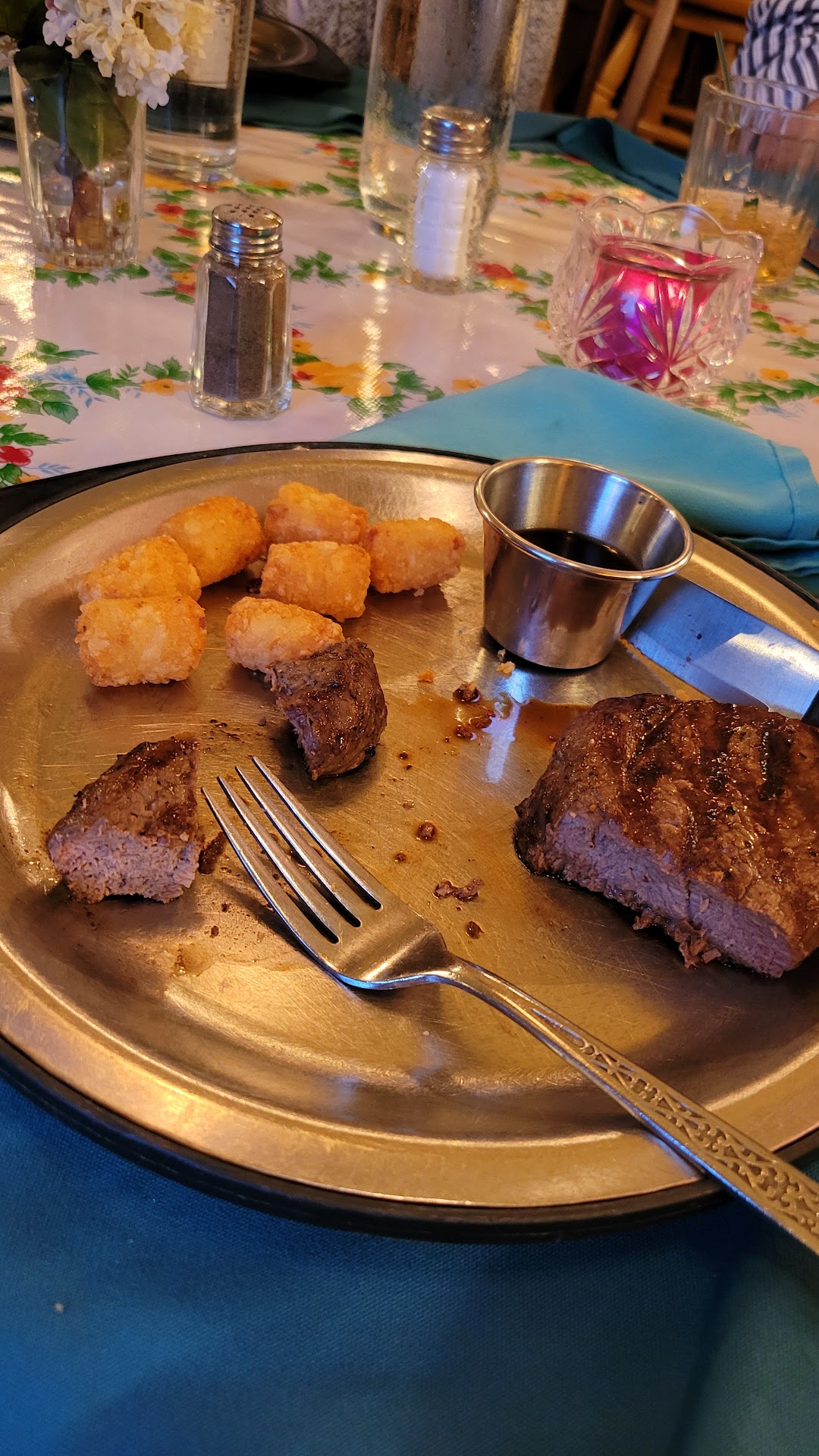 Went to dinner 6/28/25. Had never been here before, so wasn't sure what to do. Like a Supper Club, you wait at the bar and you'll be helped. I will say we waited for a good 5 minutes before anyone approached us. But luckily, Fred was huge smiles and took us to the table and took our drink orders. In total it was a party of 3. There's a salad bar that was quite popular, but no one at my table indulged. It took a few more minutes to get the order in. Ended up going with the King Filet mignon and baked potato. There were 6 other tables not including us, and there was great music and lovely conversation. The inside of this place is oddly fascinating. The decor may look outdated, but honestly it's great to browse everything. Service was a bit slow, so if you want to sit and dine right away, this is not a place for you. When we got the food, it was good. The table ordered 2 steaks and chicken Alfredo pasta. Raves on the pasta, was told it was very good. The steak in my opinion could use more seasoning BUT it was cooked beautifully! I ate every bite! Overall, I enjoyed my meal, even if service was slow- maybe they were short staffed? For me the atmosphere was pleasant, and Fred was quite a joy with his big smile as we left! I would dine again, and if you have time, I'd...