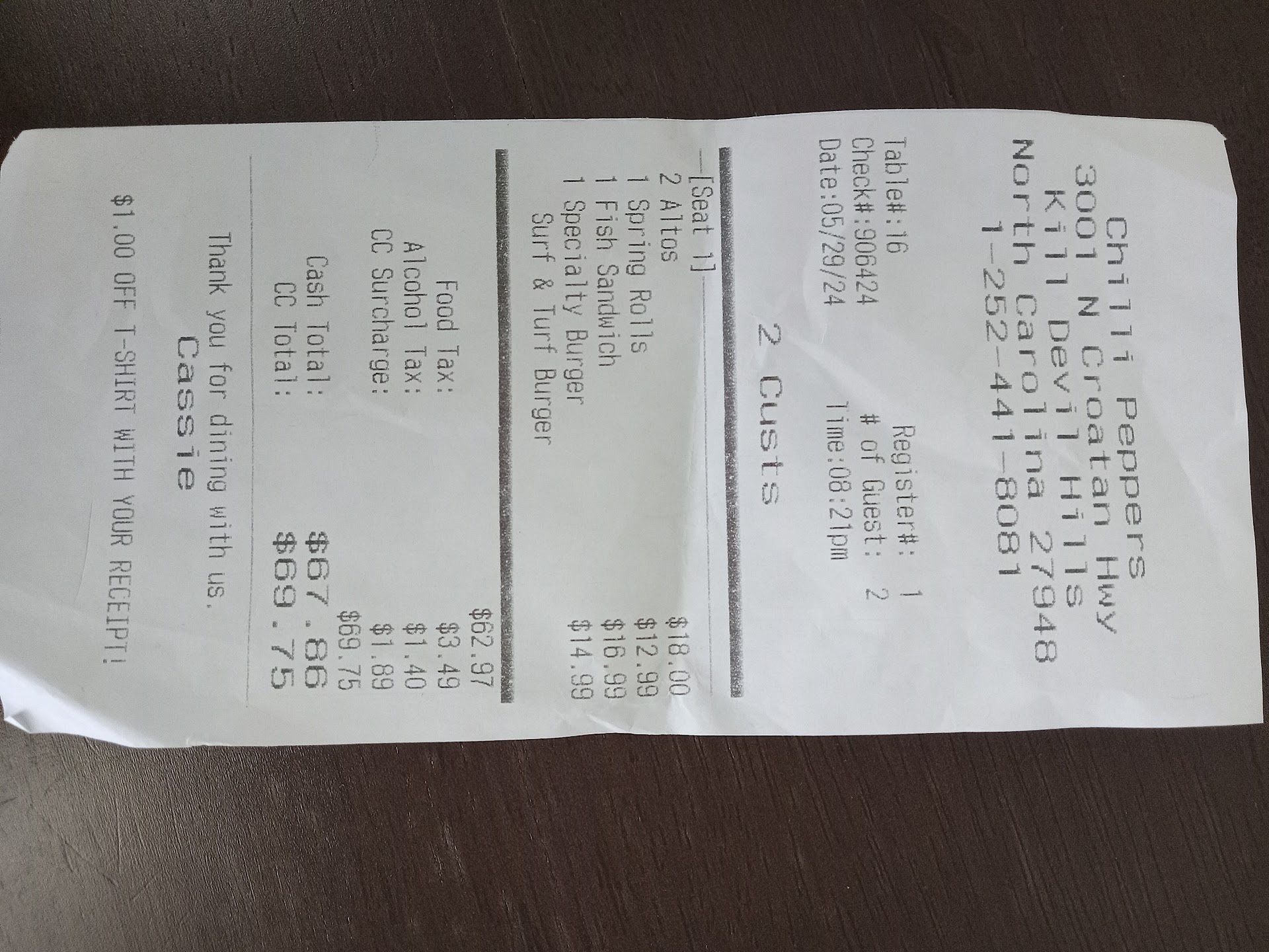 We saw our server three times, when she took our orders, when she brought our orders, and with the bill. The hostess was constantly on the move and kept us hydrated. At the end of the meal, I wanted to give the hostess a tip rather than our server. The restroom stalls in the women’s are criminally small. I hit my knee and fell back on the commode when I was getting...