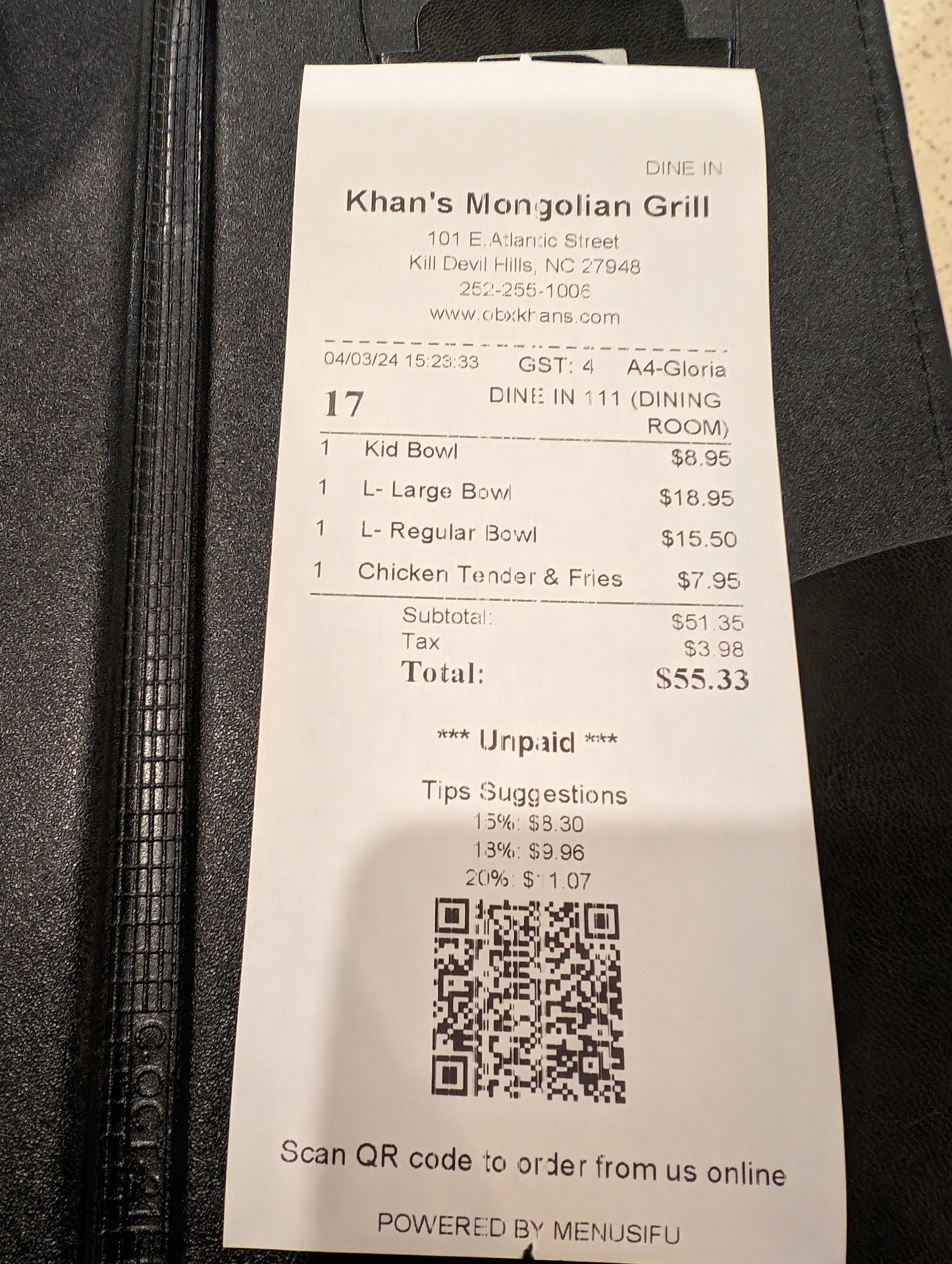 I had seen people online eat here and say good things about the Khan’s so I decided to try it out with 3 friends. Once we arrived we got seated immediately in a nice large booth big enough to seat up to 6 people. The restaurant was very nice and clean, it was pretty spacious. Our waitress came to welcome and greet us, she took our drink orders, brought us our appetizers and explained how we make our meal. She was very polite and even bilingual which is always a great! We went up to prepare our bowls and the process was easy to understand and to do. It’s done buffet style, you get a tray and bowl and go down the line picking your proteins, veggies, add-ons and at last your noodles and sauces. There’s no complaining about the food because you're the chef!😆 Once you’re done you leave your tray on the counter for the gentlemen at the grill to cook it for you. Here is the reasoning behind my 3/5 star review. We watched a couple of people get seated after us including a large party of about 6 people and they all received their food back before us, we waited almost an hour to have our bowls come back to us. During this time we needed some refills but our waitress never came back to check on us. We saw her attending the booth after us and tables around us but never came back to us. Once another young lady brought over our food we asked her for refills and that’s when our waitress noticed we needed something and came to check on us. My friends and I enjoyed our bowls but the chicken seemed undercooked as it was very light colored, I was not the only one to notice but my friends who chose to put chicken in their meal also saw this. I eventually took out the chicken in my bowl and put it aside on a napkin to finish the rest of my bowl. I don’t like the idea of putting the raw proteins in the same bowl as all of the other ingredients, or having no utensil in the line to make sure the seasoning is nicely coated on all of the protein or especially having undercooked meats in your meal. Hopefully you guys take into consideration having a separate bowl for the the proteins,...