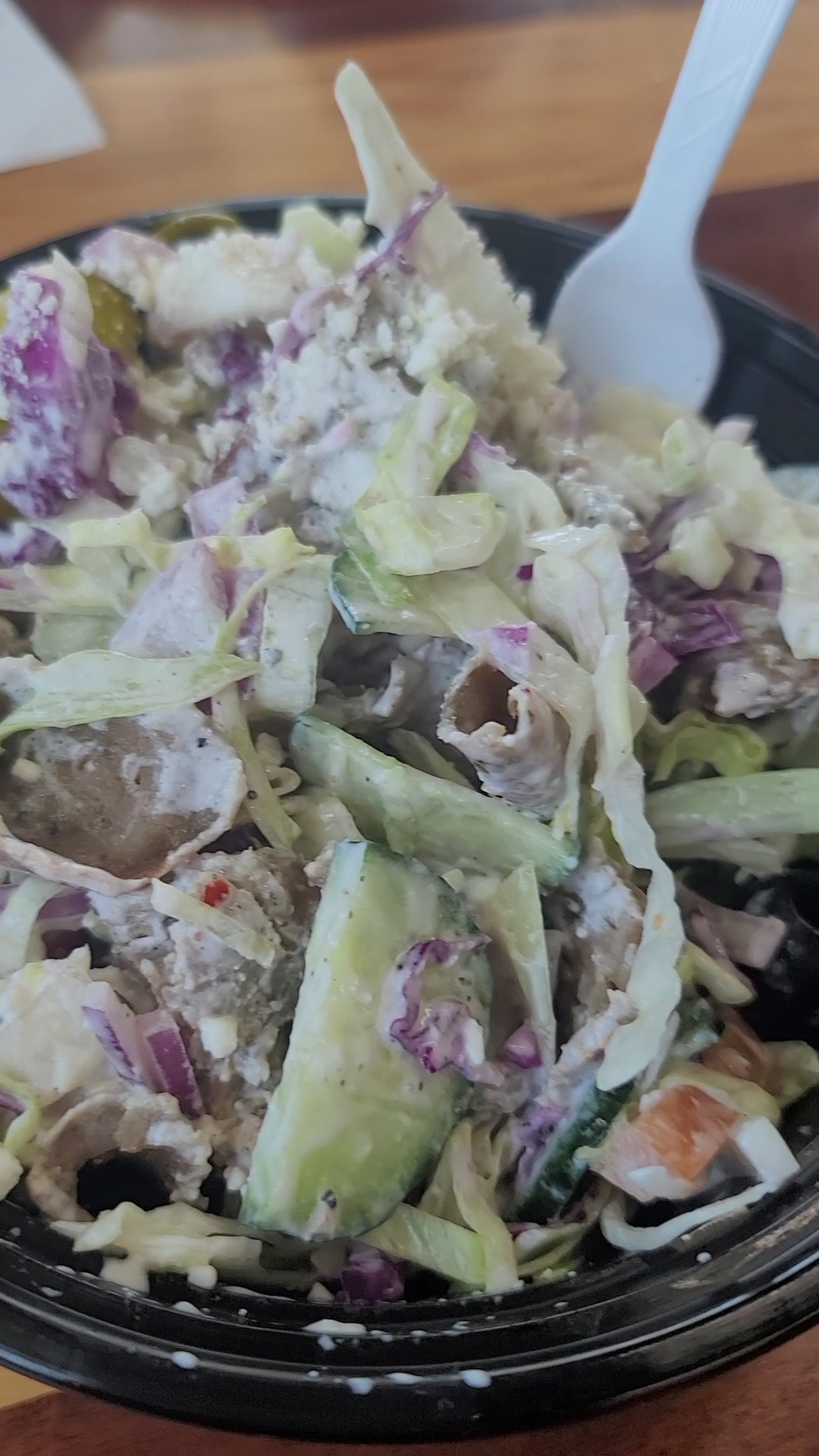 My fellow food explorers ordered the doner wrap combos with fries and a drink, which they thoroughly enjoyed. Keeping it low-carb as usual, I opted for the salad, adding the beef & lamb and feta cheese. The salad itself was a satisfying portion with a decent mix of lettuce, cabbage, tomatoes, cucumbers, black olives, a pepperoncini, plenty of red onion (which I appreciated, but you may not!) all dressed with tzatziki.