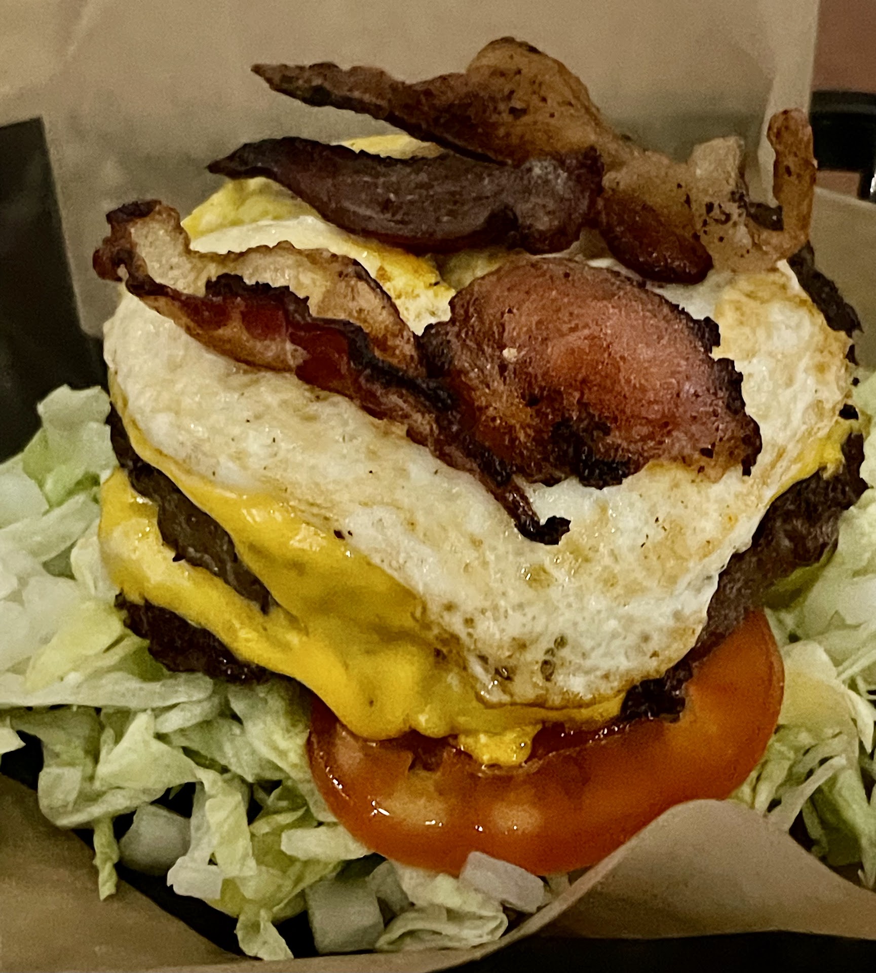 My daughter ordered The Big Weezy ATW with 2 Patties, 2 Slices American Cheese, Bacon and a Fried Egg and no bun on a bed of lettuce. She said it was awesome and one of her favorite burgers.