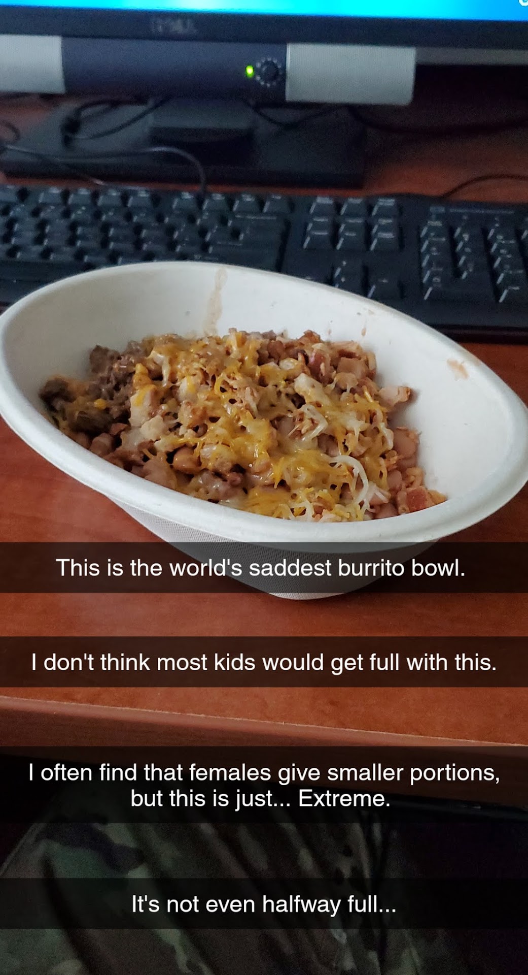 Read moreThis has been my 3rd time ordering from here the first experience was great food was great which is what prompted me to go back a 2nd time. The 2nd time food tasted weird it wasn't as favorable as the first time, and there chopping of veggies and herbs were very disappointing. I waited probably a month or so and ordered again today because I was craving chipotle but thought about free birds as an alternative being that they are cheaper and you get more portions. Well after today I will be sticking with chipotle. I got a Chicken monster bowl with sauteed peppers and onions amongst other fixings. The onions and peppers were not sautéed, some were chopped in big pieces. The cilantro was so poorly chopped I was eating more stems than any thing. There was a piece of a bay leaf left in the food. I do understand what a bay leaf is and why it's utilized in cooking, however I am not the person that likes it in my food when it's time to eat. Paid for extra cheese and didn't get it. On top of all that and paying $39 I couldn't even get a lid for my bowl instead it was wrapped in foil like I was given a to go plate leaving the cookout. Instead of actually enjoying the food I spent my time picking through it finally got tired and threw...