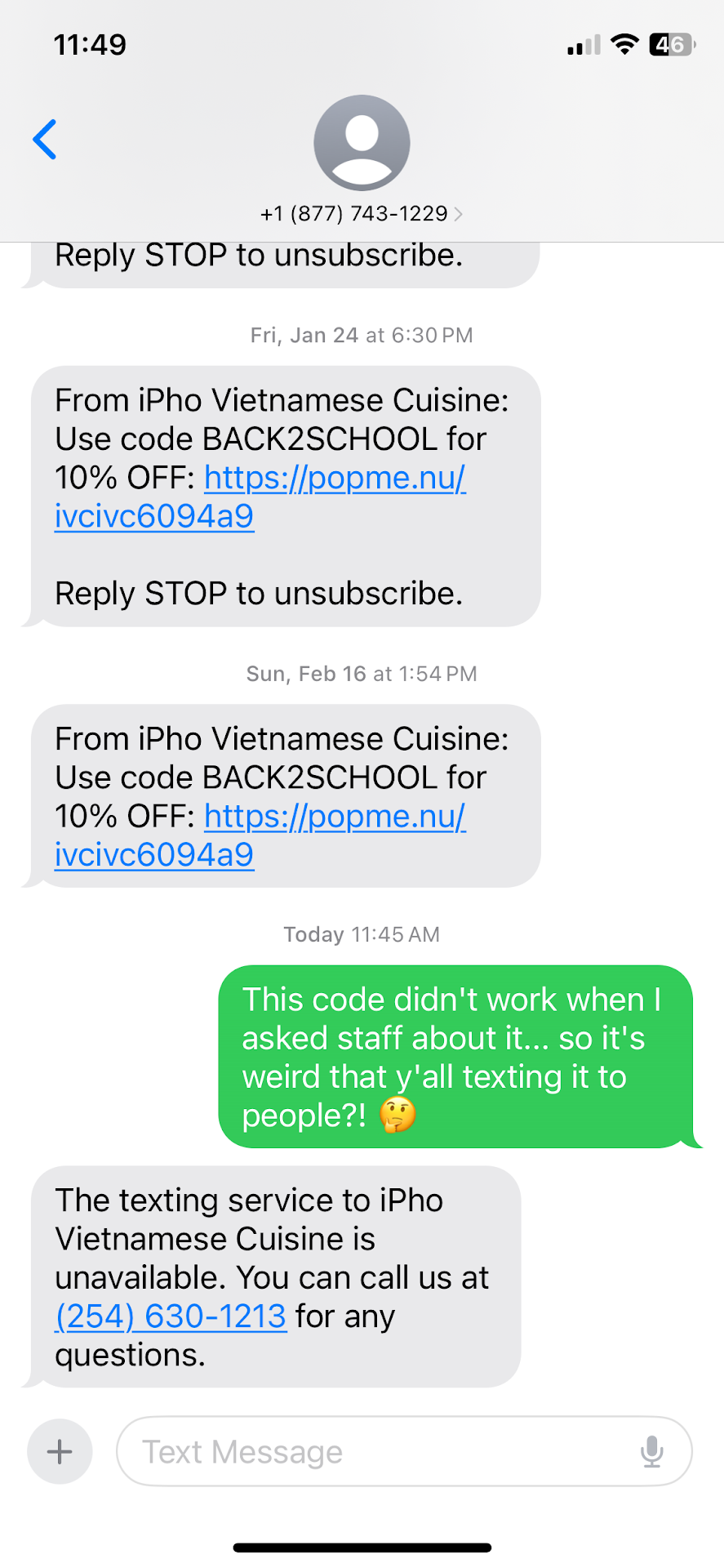 Read moreI’m confused about why you guys keep sending out this sms with a coupon code every month, but when you’re in store ordering, staff refuses to honor it. Please update your SMS advertising if this is the case… super annoying to get texts from you when it’s a misrepresentation and doesn’t even apply.