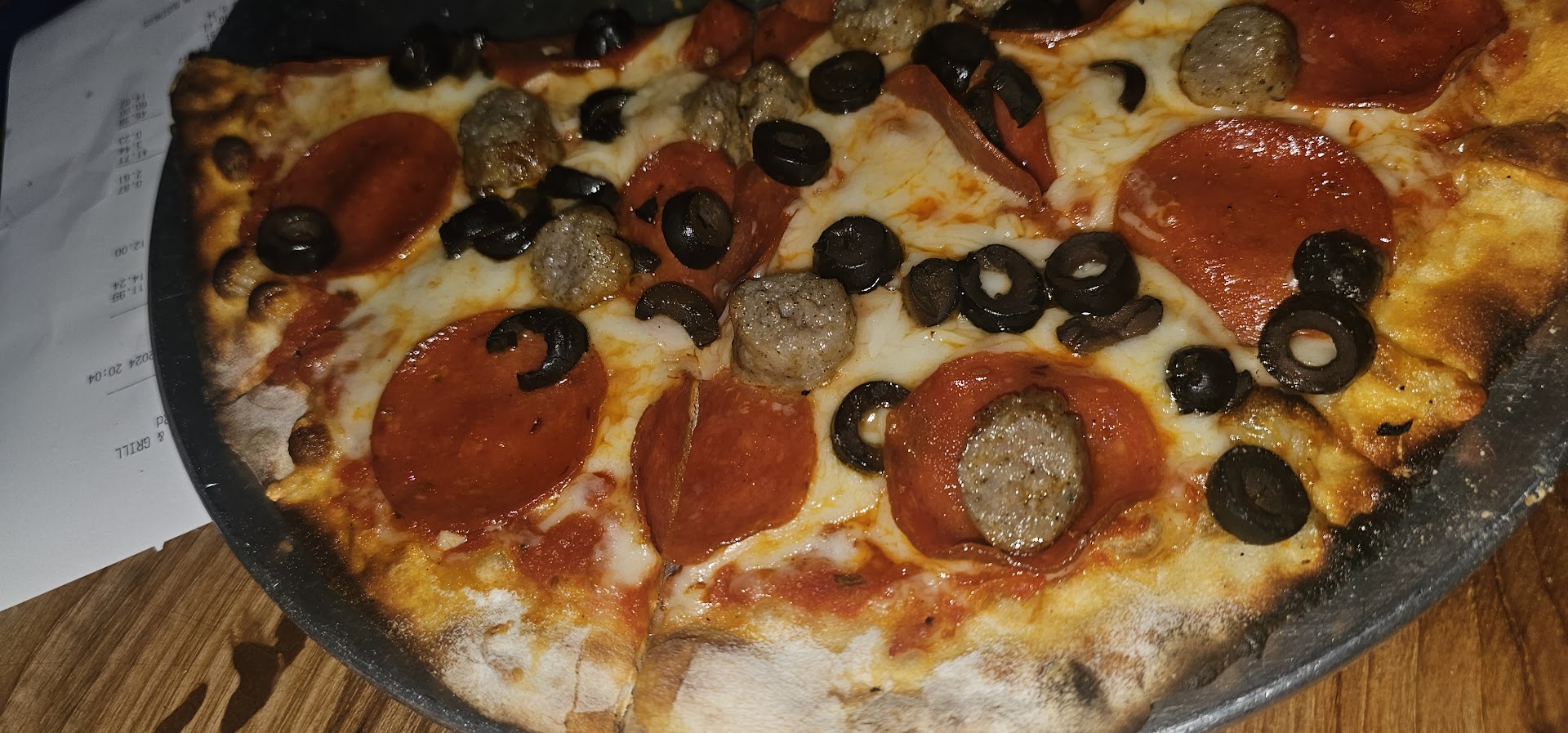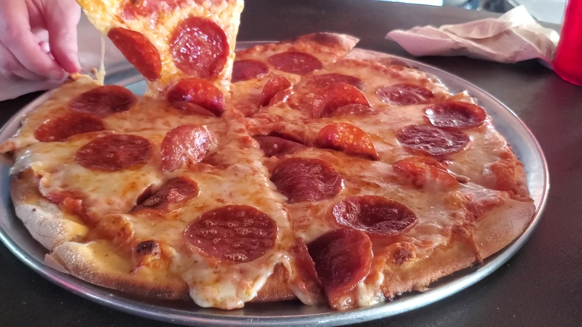 The pizza arrived first. We didn't know we needed to ask for plates and parmesean cheese. So it took us a few minutes to figure that out. Love the thin crust on it and the sauce reminded her of a canned sauce...I was alright with it but the wife not so much. The burger was the star of the show. Juicy, thick and gorgeous, it hit the spot. Love the sidewinder fries you see in the video. I should have thought ahead and asked for ketchup.