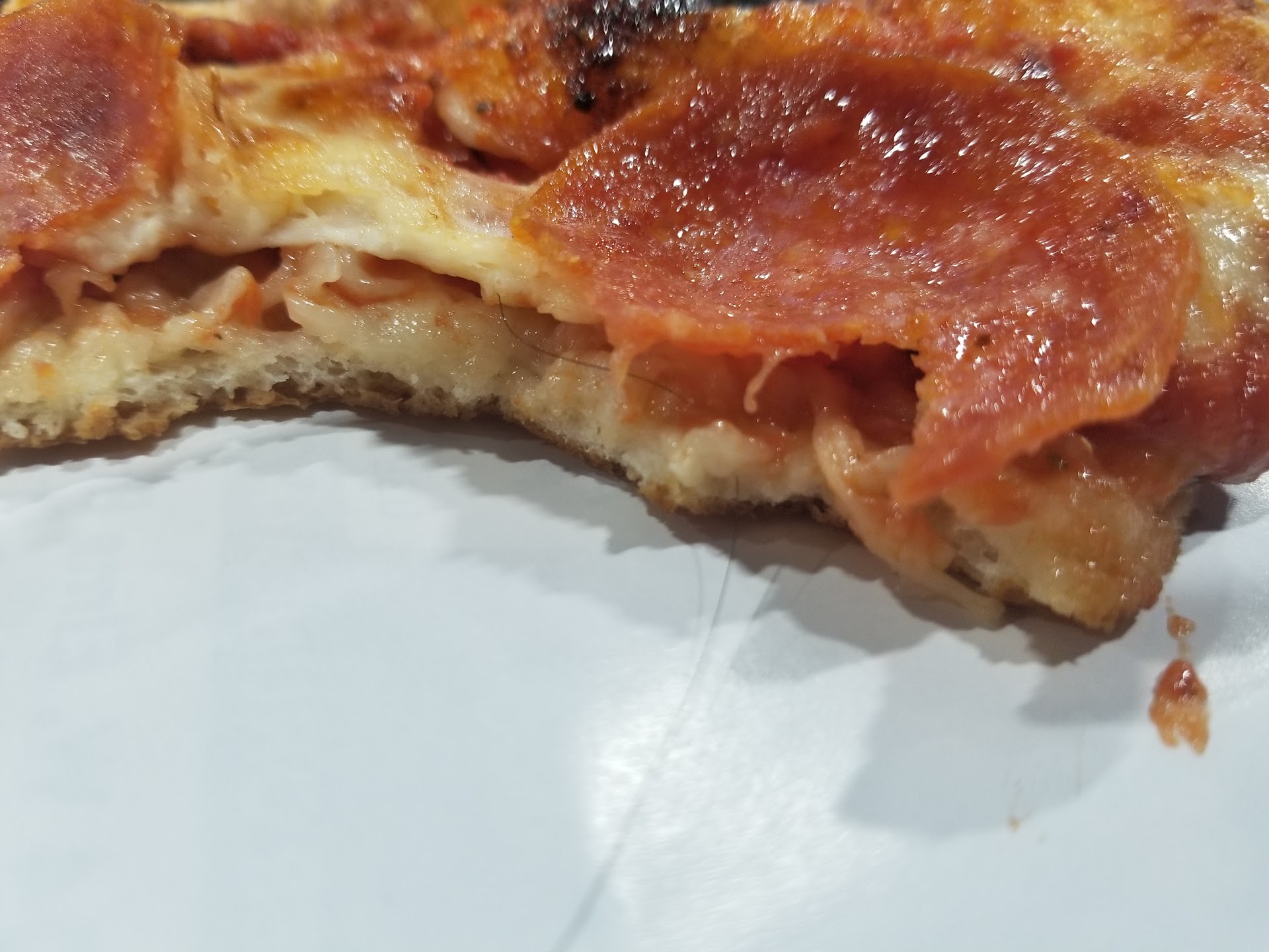 The cheese was thick and sticky with the consistency of glue. The pizza was built with a lot of bread—like biting into a sandwich; probably the thickest pizza we have eaten. There was not a lot of sauce, but what there was seemed light in flavor. The pizza slices were dry and nearly tasteless; we added Parmesan cheese and red pepper flakes to liven it. Some of the ingredients did not seem fresh; some of the pepperoni tasted acidic and off-putting so we picked them off. The ingredients were spread thin and sparse as if the kitchen had been asked to limit the quantity of toppings.