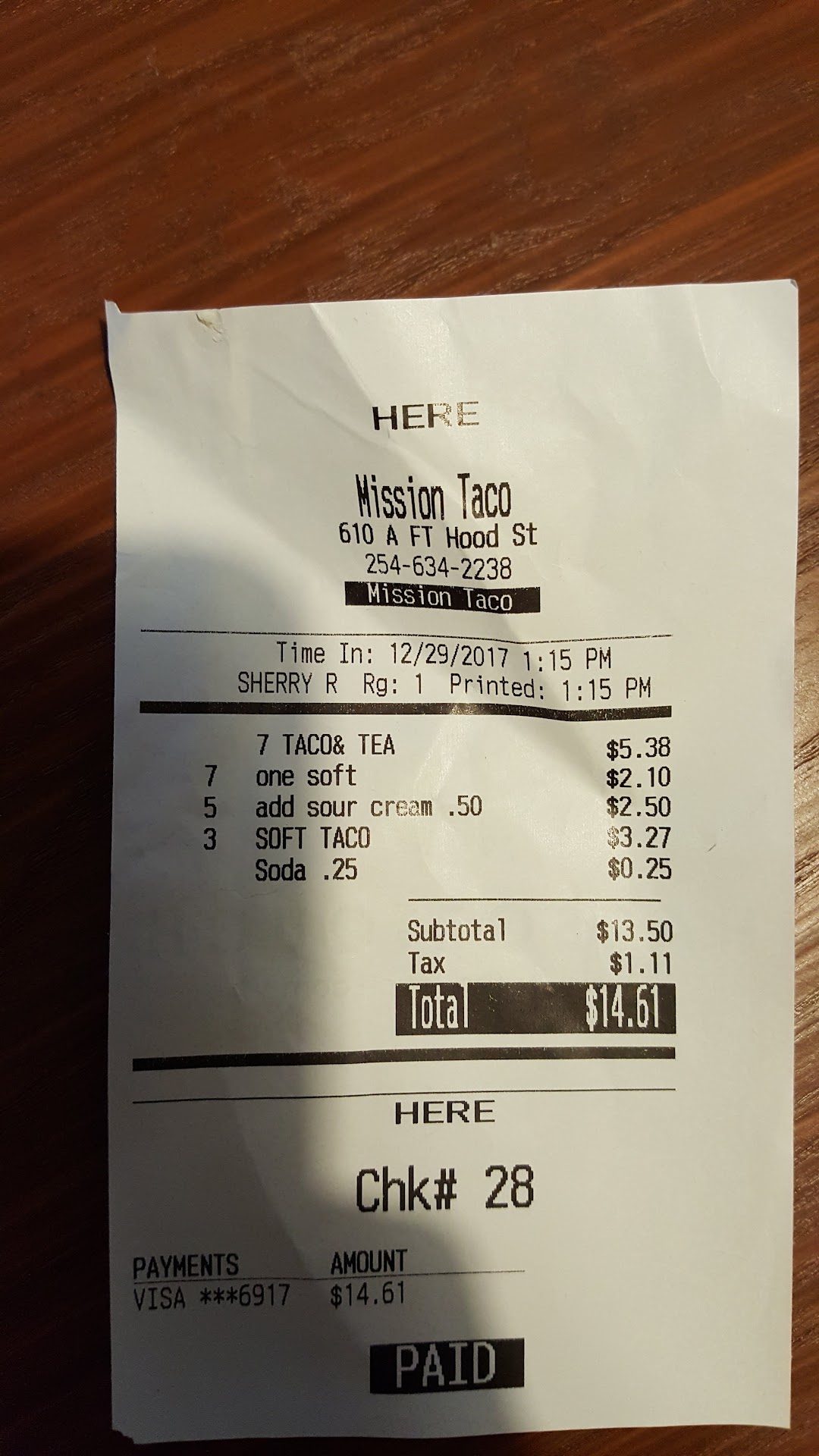 This used to be my go to place for tacos. I would over look a lot of down sides because the price was right. Well, they recently upped the prices and I think it's time to move on. I know of at least 4 times I have drove to their location (which btw is a pretty ghetto looking area, their door was busted out one day) during their normal operating hours to find the place closed. So, it's best to call first to make sure they didn't decide to take the day off and you end up wasting your time and gas. Their prized advertised 7 tacos for $2 (which is now $3) is misleading. You have to order a tea separate with it which brings the total to $5.38 if you take them as they come. If you want to make them soft tacos that's going to cost an extra $2.10 and if you decide you'd rather have a soft drink instead of tea, well that's an extra .25 and refills are .75 no matter what you drink. Oh yeah and sour cream is a whopping .50 per taco. More than not they tend to go skimpy on the meat and they put enough lettuce on the tacos to make a decent salad. The tables are usually dirty and the bathrooms are pretty nasty and cramped and there isn't a changing table or anywhere adequate enough to do so. The parking is horrible and you have to bus your own table. The owners and servers are a little strange. Also, do not go during lunch break on weekdays cause they are very crowded with Soldiers coming in for a cheap meal. If you can over look the above it's a decent place to get some cheap tacos.