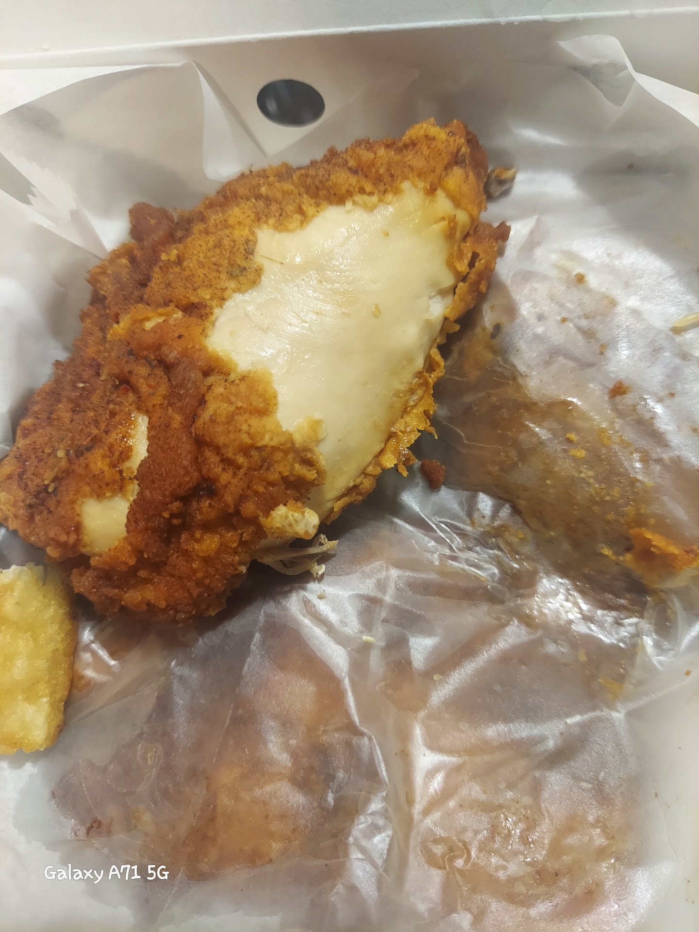 3rd- the food. For me it was not really the best I've ever had and I was raised eating fried chicken. I did find the flavor of the skin good. It was seasoned well. But the chicken was drier that white meat should be. It was also not battered well. A couple of the pieces were inconsistent where one side looks like KFC original recipe and one side was crispy. And a couple of pieces looked like my picture below there part of the skin was missing. I don't know how you manage to remove the skin while serving so this has me scratching my head. As a side, I got fried yucca and Cole slaw. I love that yucca is one of the opening for sides but for me (first of all, it was cold when I got it), there was no flavor, no salt, no seasoning. Apparently we're supposed to use their dipping sauce for the yucca. And y'all .. if you take BBQ sauce and mustard and mix it together... That's what that sauce tasted like. So nothing to write home about, in my opinion. I didn't actually eat the Cole slaw but it did look good.