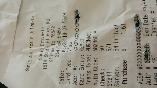 Read moreI'm not sure how to feel about this sonic.. The first crew member taking my order instructed me to download the app for the promotional discount I had received via text message earlier that morning. I downloaded the app, transferred money to a digital gift card to place the order, and saw no option to apply the promotional discount. I'll pay $5 for two cups of ice cream but there is no way I'd be willing to pay $10 so I rang back in. The crew member seemed somewhat confused on what I was asking, that could have been my fault, (I know that I have a soft voice and maybe it was misheard) but we eventually got the order through with the promotional discount applied. I paid using the money I had transferred with the app and waited for the food. The blasts came out with no napkins which was a bit unfortunate, however, they tasted amazing. I was disappointed that they no longer came with whipped cream but that isn't this particular locations fault and with it being such a high calorie treat it isn't really needed regardless. The carhop was very quick and friendly. The entire process took a ridiculous amount of time due to the initial hangup with the app, I really wish the first crew member would have been more knowledgeable with their current promotions. Overall, it did not ruin my evening, we still had our 800...