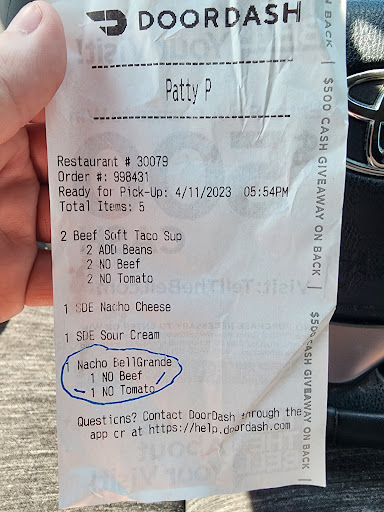 Read moreNever once had a problem with this place until yesterday and today (4/11/23-4/12/23) Order thru doordash. As you can see by reciept i ordered bell grande NO TOMATOES cause i am ALLERGIC. however by the pic of food you can see the employees didnt care or pay attention and theres sooooo much tomatoes ruining the food for me. Doordash didnt help me at all when i called them. I called the manager last night 4/11 and her name was mariah she apologized and said the food would be remade if i came and got it. So i said sure i can do it next day. She took my info down for manager today (4/12) When i called the female manager today was not only rude as hell and wouldnt let me finish what i was trying to say she put me on hold to see if they could remake she said that mariah gave fals info to me. She got back on phone told me to come with reciept and then hung up. Rude as all heck! Not only were the employees negligent for the order the manager wouldnt take credit for THEIR mistake. It wasnt doordash mistake. It was taco bell employees! Yall need better...