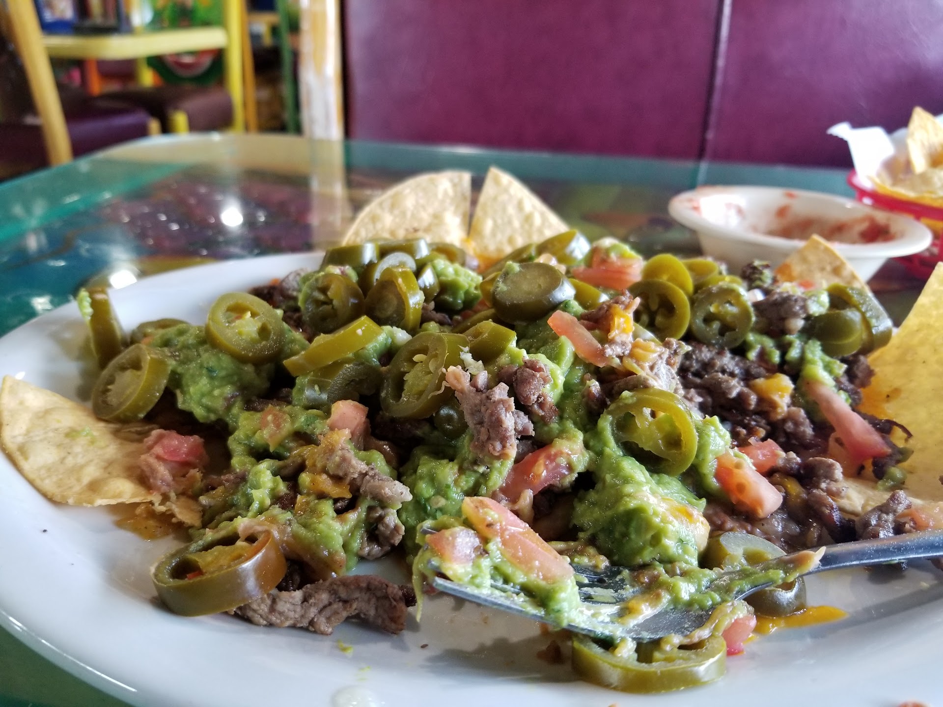 My entire for today was Taquerias beef fajita nachos which you're right is technically an appetizer but I was eating it as a main. The order was assembled, prepared, and served rather promptly which is fantastic! The nachos however were NOT. The plate was plentiful with toppings of guacamole, tomatoes, cheese, beans, and " beef fajita " and invited you to dig in. Chrunchy? Yes. Cheesy? Yes. You get the contrast from the crunch of the chip with the soft texture of refried bean and the guacamole, and then something very chewy........the beef fajita. This is where my whole dinning experience went down the toliet.
