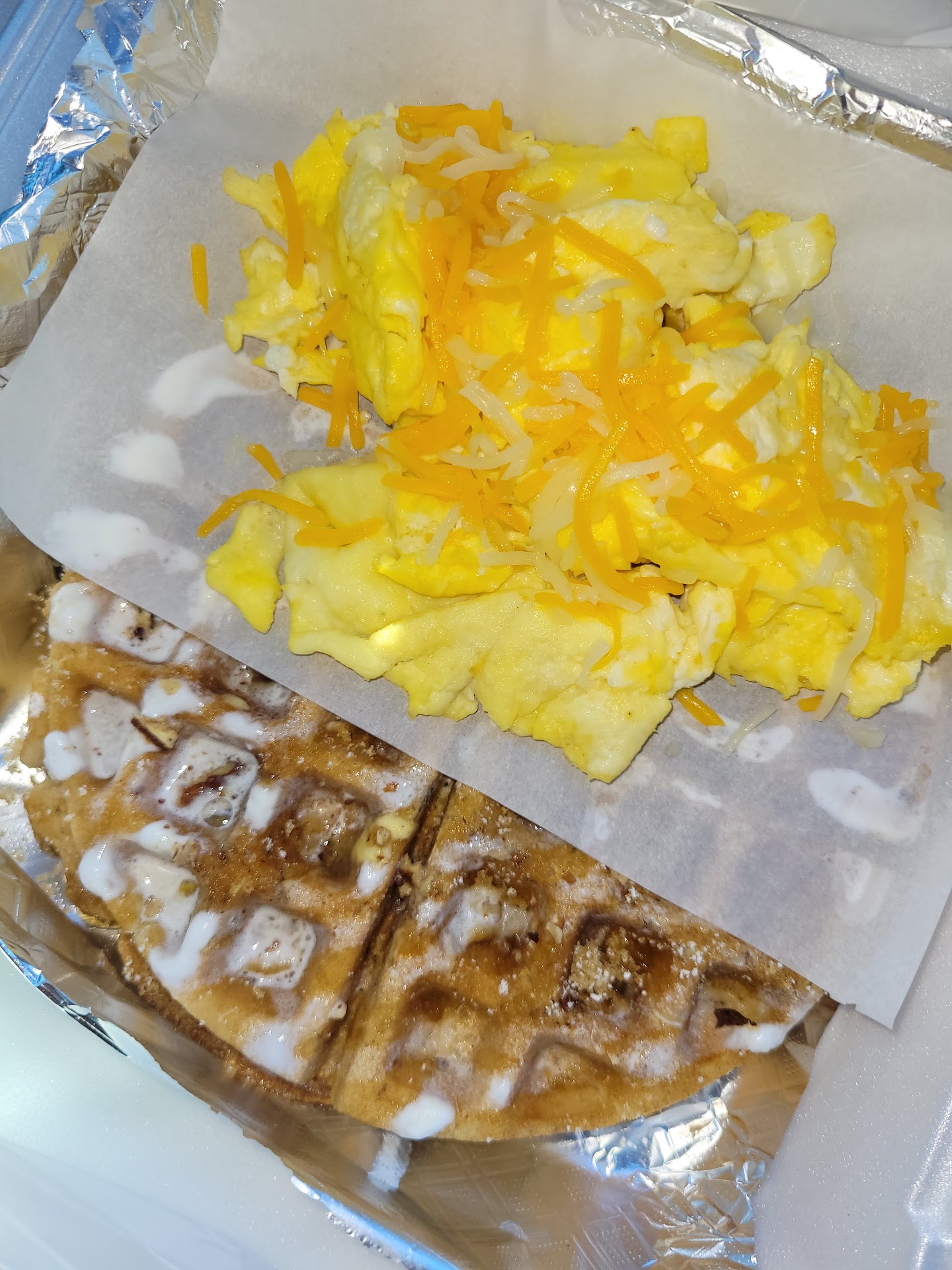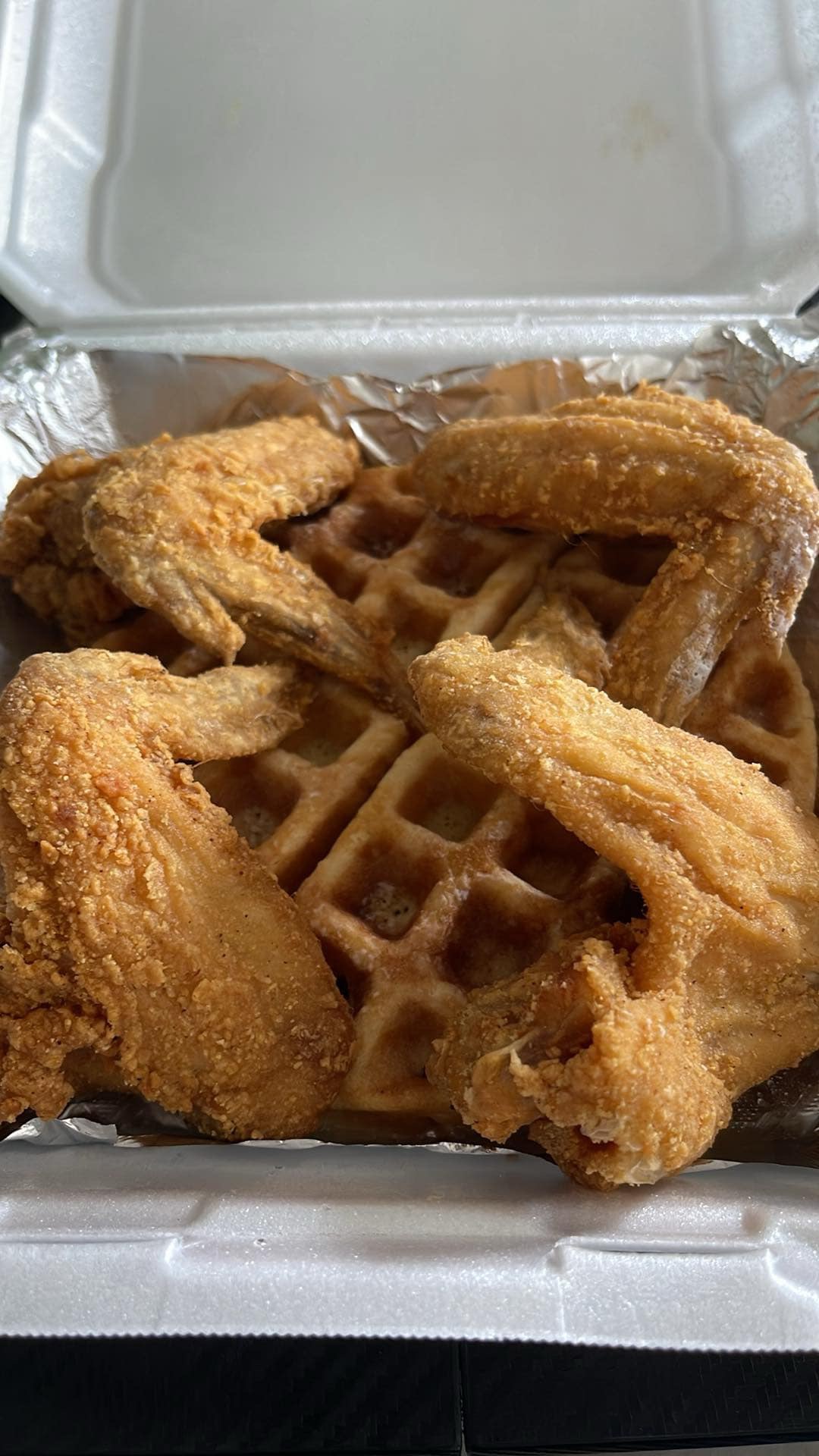 Read moreI pulled up to a door connected to the side of a gas station and initially I questioned my decision. I soon realized that there were two lanes leading to the SIDE of the building WAITING to place drive thru orders and people standing and waiting INSIDE. Surely there couldn't be this many people at one time, in one location, ALL with faulty tastebuds!!! I stepped inside to see a menu on the wall with SO MANY DIFFERENT waffle options!!! Now, I was hesitant to feel real excitement as we had just been to a "popular" breakfast joint in Austin that had a full restaurant setup and a 40 min wait to deliver an apple waffle that consisted of a plain waffle with diced apples toppled on top. The Waffle Den has a mom and pop diner setup which is ACTUALLY FITTING!!! I felt at home!!! You walk in and you see faces popping up and around the corner to see you and greet. The lady taking our order was professional but PERSONABLE!!! She handled me and my multiple questions and order changes with a smile and grace. As we sat and waited for our food, I honestly didn't keep track of our 20 minute wait...THEY did!!! Watching them interact with the regulars that they new on first name basis and them interacting with new faces like myself,...time wasn't a concern. One the gentleman told us we had been waiting for a while and asked our name on the order. He goes to check on it for us and let us know that it was almost finished.. .when they brought out our waffles, they had smiles making me feel like a birthday slice was being brought my way....they knew the gifts they were bringing, we did not.....I ordered a BlackBerry waffle that came to me in its purple, fluffy splendor SMH Its perfectly crisp exterior was laced with cream cheese drizzle and two golden fried wings accompanied with a bottle of Louisiana hot sauce....I am new to the chicken and waffle culture so I didn't dive straight in, I pulled my wings to the side to enjoy separately....my fork broke the crisp exterior to find a fluffy, moist interior (queue the happy food dance). The wait of so many was understood and justified in that one bite and every bite after...the waffles were the star but the chicken was not an amateur act. Think of home fried chicken....got in your mind??? Great!!! That's what they're serving!!! An older gentleman was walking through talking to everyone and picking up their finished plates. He came by our table and told us to let him take some things off the table and out of our way...made me feel like we were amongst family. They aren't simply selling varieties of waffles and chicken....it's SOUL food!!! Don't...