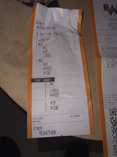 Ā Ā Ā Read moreNormally I don't comment on fast food. But today is the day. I have come to this Killeen location maybe 4-5 times over a 3-4yr period. Today ordered x2 patty melt meals. Look at my receipt time stamp. I was 5 cars back waited about 7-8min for them to go thru. Then I became the lead car in front, told to wait just past the window, 5min minutes later young lady came to my window with a drink. Asking did I order a drink. Already was given my 2 drinks. Waiting on food. She then called me someone else name. Then asked what's my name on order. I told her, she said well what did you order, I smiled said x2 patty melt meals. She said I will go check on your order. Another 5-7min go by she comes back with bag. Now I know for sure after all wait time my food should've been freshly hot fries, freshly made patty melt. That was not the case. Fries were barely warm. This is not the first time this has happened. I saw dining room was still open but I just didn't feel like getting out going inside and having to wait another 10min for them to make me some hot fries and new sandwich. Now I know why I don't come here often. I used to tell people go to whataburger they make your food hot and fresh when ordered. This hasn't been the case in years. Now I am officially one with whataburger. You have done this too many times. For $26 this is what I get. Nope never again. Years ago this was not the case food was always hot and fresh cause that's why line is always so long and mind you there were 2 rows of vehicles this time. Not sure who got afresh meal, I bet none of them. Good job what a burger. You lost a customer on this one. Receipt time stamp no way it was 6min when I waited every bit of 20min to get this crap(explicative). I'm...