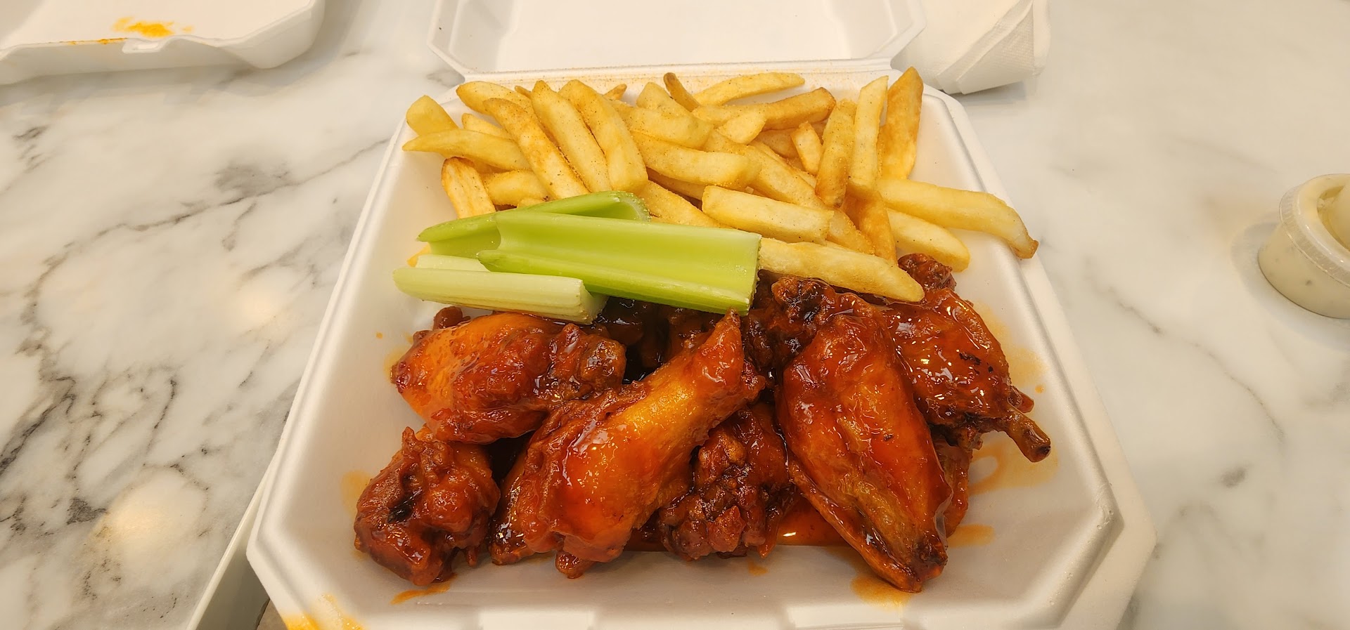 With intrigue piqued, I ventured to order - buffalo wings, a classic choice, accompanied by the ever-reliable sidekick, fries. As I placed my request for all flats, a twist in the tale emerged. Denied this customization, I was left to ponder the unseen rules that governed this establishment.