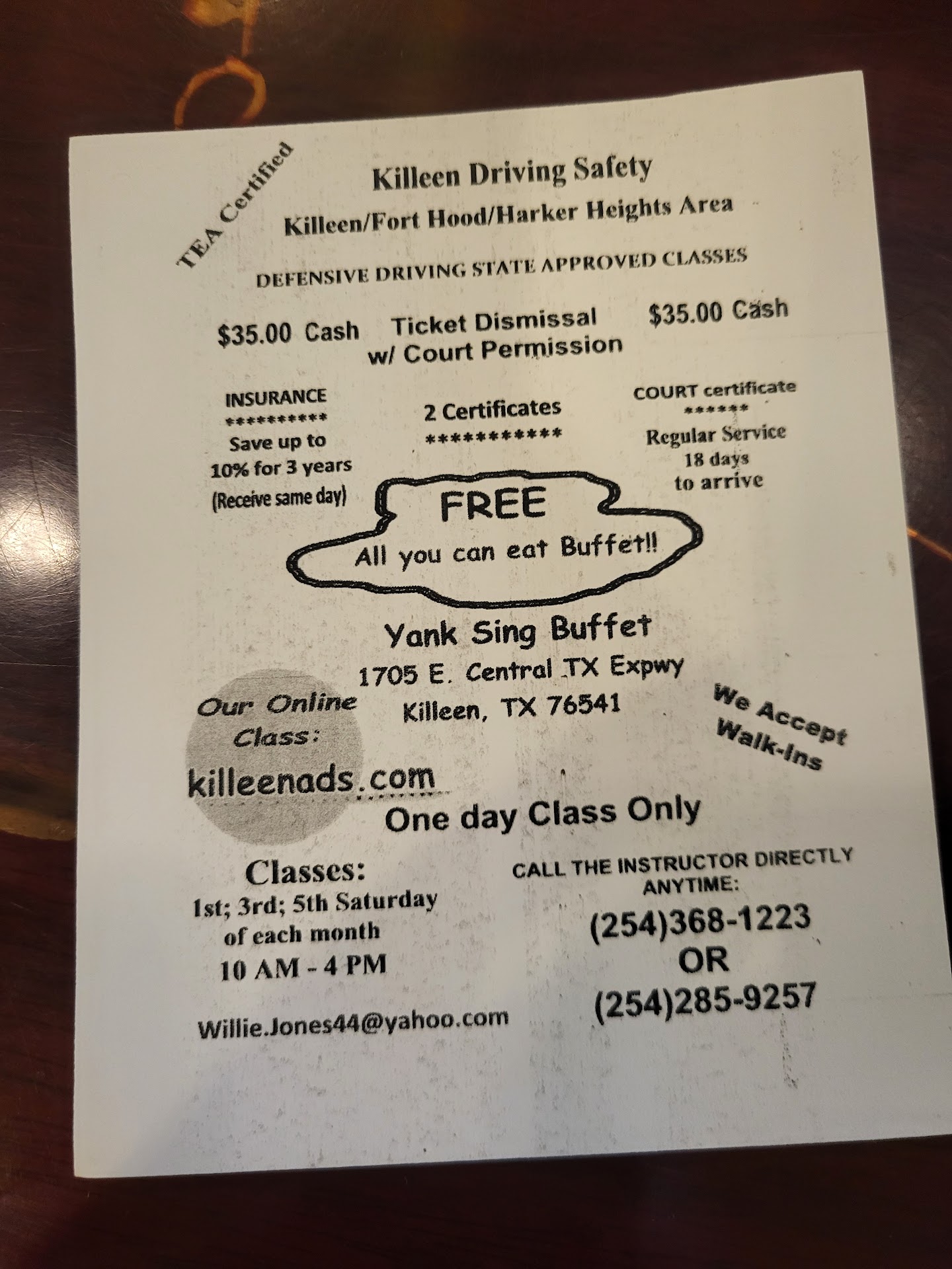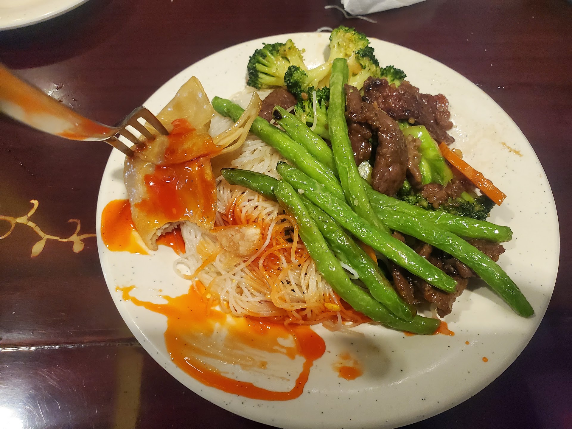 The food was just not there. It wasn't bad but it wasn't good. It's a solid 2 out of 5 and the main reason for the rating. Sausage that tastes like it lost all flavor and was soaked in fake sausage flavor. Dumplings that would make any dedicated chef disappointed. No pretty crimps or twists, just stuffed and... Flattened? They look wrong. The egg drop soup was over cooked. The sushi was old and after trying it, I wouldn't trust it.