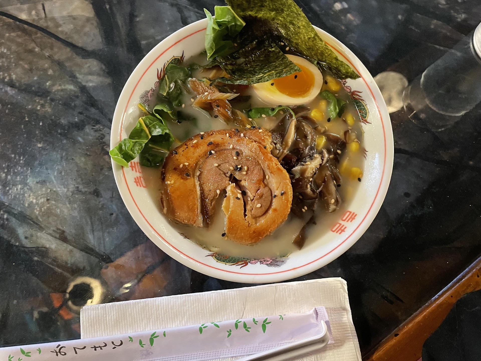 I ordered the āgang gangā shrimp, edamame, a miso ramen, and a tonkatsu ramen. Everything was fresh, delicious, and the ingredients went beautifully together both visually and on the palate. The noodles were cooked al dente, the broth complex. $20 for a bowl of broth and noodles is a bit pricey, but the portion is generous, as is the accompanying cut of pork which was thick, infinitely tender, and tasty. Then the corn and greens provided a nice crunch and contrast. The half egg was wholly excellent with a bright orange yolk.