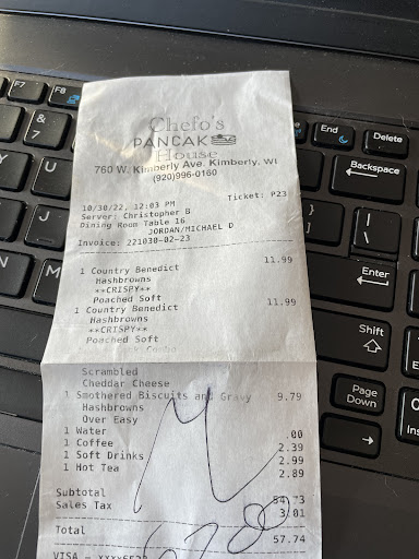 Amended 31JAN23… I was reconciling my CC statement and just noticed Chris double charged me for an order he failed to bring (see below). This was insult, added to injury, added to my credit card. Bottom line, I won’t be returning to Chefo’s. Original post… I’d started going to Chefo’s over three years ago and have been there probably 20+ times. I was impressed, but not anymore. The poor service and declining food quality now offsets where they had excelled. I’ve given them several chances in the past three months and they’ve struck out. The last time was similar to what I’ve recently experienced. We sat down and it took 15 minutes before I complained and Chris (owners son?) brought menus and took our drink orders. He pointed out our server and said she would be right over. We watched for another 5 minutes while she did everything, but stop by and say she was sorry for the wait and would be right there. I’m not looking for anything, but recognition that they’ve treated a fairly regular Customer poorly. The tables are dirty, service is slow and impersonal. My orders have been delivered late, wrong, and the food quality is declining. We left after just a half cup of coffee. Contrast this with their competitor, Chico’s, where I ended up. We’ve sat down and within 12 minutes I’m on my second cup of coffee and we’re sharing my GF’s soup. The greeter took our drink orders and we’ve spoken with two friendly servers.