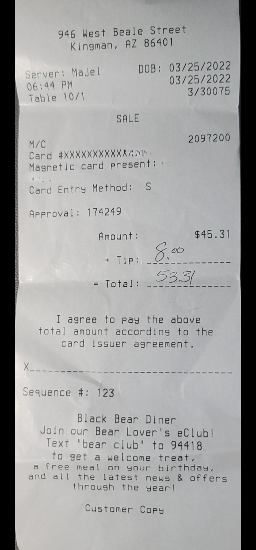 Read moreAfter our experience this morning I am surprised to read good reviews for Kingman Blackbear Diner. We usually go to Bullhead City Blackbear and have had excellent service and very uplifting, light atmosphere there. But this morning we made the mistake of going to Kingman instead. We stood at the entrance for at least 3 minutes before they even acknowledged we were there even though they was standing right in front of us. We could not hear anything the person seating us was saying so we just followed but was thankful she gave us a booth. The waitress was fairly prompt to get our drinks and fairly prompt to take our order but from that time we waited far too long for our food. At least 30 minutes. During that time of waiting we was ignored and not waited on at all. When our food finally came it was cold and as a result didn’t taste good. We finished eating without even one waitress asking if our food was okay or if my husband needed his coffee filled. We had to go to the checkout to get the ticket for the meal then she just charged us without even letting us look at it. Then when we said something about the price she laughed and said that was cheap. We felt that $27 for our breakfast was rather spendy considering we didn’t get any real service and our food was cold. She did apologize for laughing. Said she thought we was joking but it kind of made the situation worse. We feel that IF we go to black bear diner again we will drive the extra miles to bullhead city where the atmosphere is light and happy, service is fast and the...