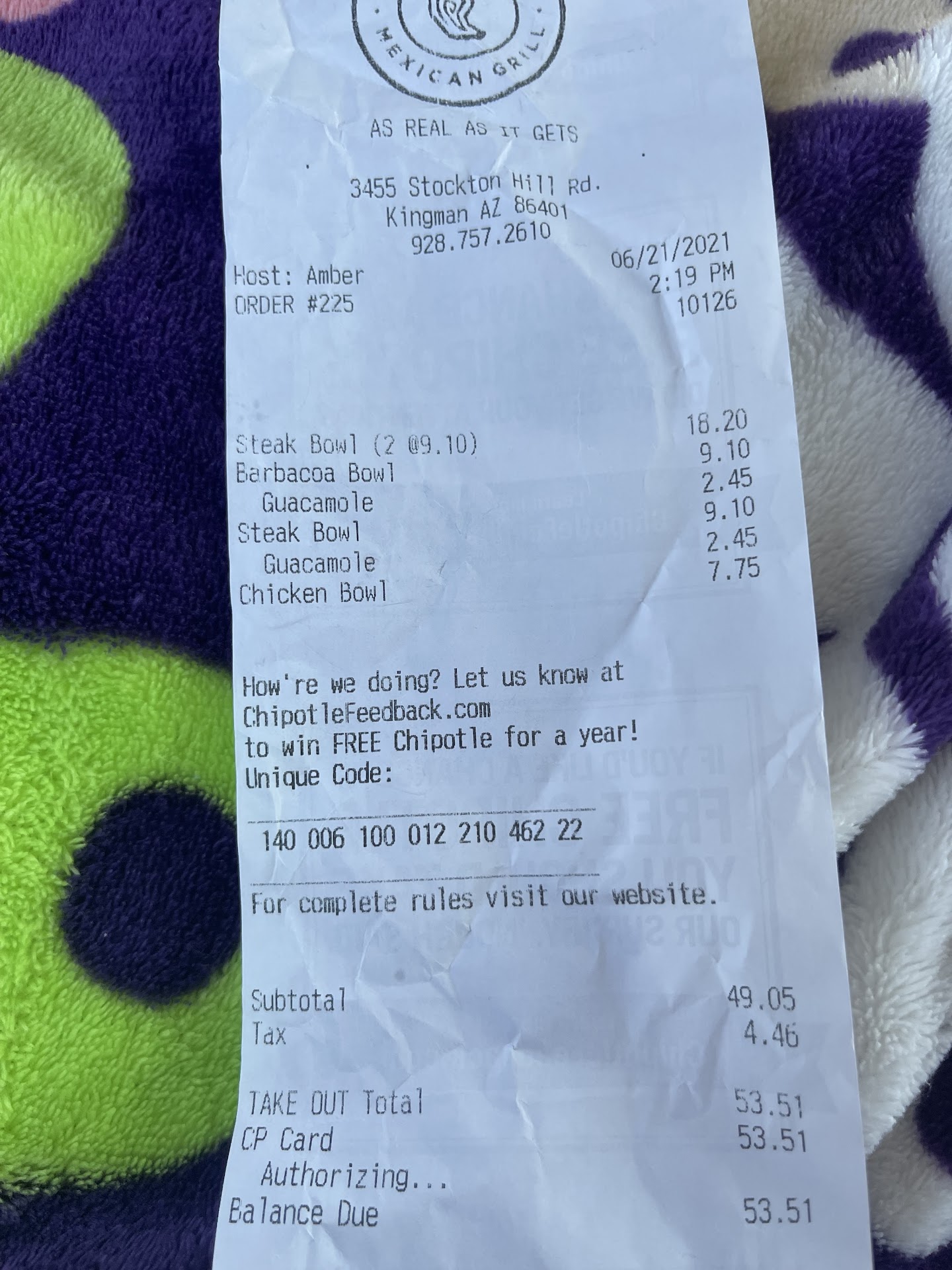 Read moreVisited on 06/21/2021 at 2:19pm. Passing through Arizona, wanted to stop by Chipotle before reaching my final destination. My family and I were extremely excited since we had been driving all day long. However, the experience & treatment that we received at this location was EXTREMELY bad. Never have experienced such bad service! We were helped by “Amber” as our receipt states. Since the beginning, she was not as friendly as she was to other guests. We ordered 4 bowls & 1 taco order. For the first bowl order, we began by asking for “white rice” where she rudely interrupted us to say “it’s either brown rice or cilantro-lime rice” so we proceeded to say cilantro-lime rice for every other order. Do not understand what the problem with saying “white rice” is. We were served extremely small portions, which we are not used to at our local chipotle store in El Paso, Texas. She kept hurrying us up and asking us “what’s next? What’s next?” Rather than getting more staff to help with the rest of the orders. There were at least 3 more people that could’ve helped her. We decided that this experience was bad on itself, payed and left. However, when we reached our car, my little brother opened his bowl up to see that only HALF of the bowl was served. This was the cherry on top. I went inside and asked her if we could receive a new FULL bowl since this one was only half-way filled. The girl at the register told us that it wasn’t her fault, that she served it full and that it probably got mixed up in the bag. I repeated, okay i understand can i please get a new bowl done? She said to throw away the half-done one & that she would make a new one. I did exactly that and she made the new bowl. I don’t know if the staff was having a bad day, but there is no excuse for this kind of behavior since we are used to being treated NICELY by chipotle staff. We are incredibly disappointed. I don’t think we will be going back to chipotle...