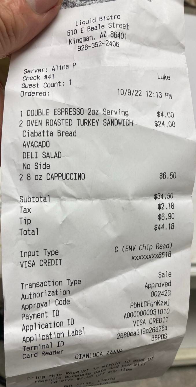 A complete disappointment I would spend less in Beverly Hills, get better quality and service I do not mind to spend money, but with that said, I expect quality and service. My 2 little boys wanted a cappuccino and a something to eat. so we stopped at this Cafe' in Downtown Kingman. 1 Espresso served in paper cup (and terrible blend, bitter) $4.00 2 Micro turkey sandwiches served with plastic fork $24.00 2 small cappuccinos 8oz $6.50 total $34.50 !! 20% Tip and you have pick up your own food yourself, it is like a fast food where they charge you for service that does not exist Total with taxes and tip for 2 small sandwiches. 1 coffee and 2 small cappuccinos served in paper cup and plastic "silverware" as they call it... $44.18 in Kingman AZ WOW! I was with my 2 children and I did not want to ruin their meal, but I had to say something to the owners of this cafe': you are out of touch with reality. If you want to charge $4.00 for an espresso, better first get a good quality blend, second, get a ceramic cup, third, have your waiter deliver it to the table. Same story for your overpriced cappuccino. And for the $24.00 for 2 little sandwiches, do not even get me going... at least provide real silverware, not plastic cheap forks. Seriously when I go to Beverly Hills for business breakfast I spend less and I get better...