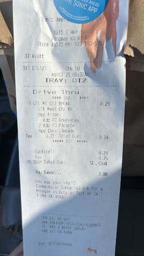 Ā Ā Ā Read moreDon't waste your time or money on this place. They obviously can't keep people working there because every time you go it's a new group of people who are "sorry" and "are all new " and those will be the excuses for ordering ahead on their app driving to their store and waiting till almost every stall is empty after "checking in" then when you've had enough dont wanna wait any longer for carnival food and just want your money back they will bring you a receipt with their corporate number hand written on it not a refund or anything stating their refunding your money... it's 11 days after the fact all this happened and I've still yet to receive my money back. This company is a bunch of thiefs hoping you forget you didn't get to eat or your money back in a timely manner well I haven't forgot. And I'll never pay money to eat at another one of sonics stores no matter who owns the franchise I've been to the one by my job in wichita and their always messing food up not having all the ingredients to make their food proper but accept the money without warning anyone paying...