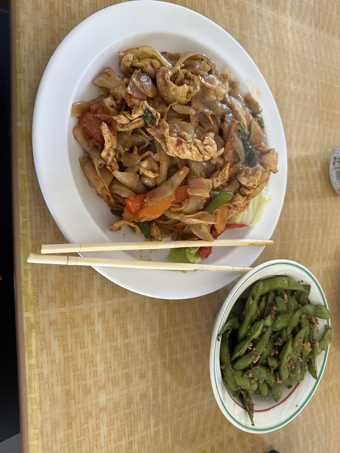 This was our first visit to this restaurant. I think the hostess/waitress assumed we were with the couple in front of us because they said party of four but there were only two of them there at that point. We were ignored for a good 20 minutes and just about ready to leave before we were even asked how many in our party. She seemed surprised we were still standing there after she sat the other people. If you are sensitive to cold air blowing on you, definitely bring a jacket. We started out with Chicken Satay. It looked good when she brought the plate out to us. The taste was somewhat bland compared with what we've tasted at other Thai restaurants in Arizona and Nevada. I ordered the Chicken Chow Mein and the other person in my party ordered Green Curry with Avacado and Chicken. My meal....was not what I expected. There was a strange flavor I couldn't quite figure out. It tasted smoky but other than that, not much of any other flavor. I know it's not a traditional Thai dish but I expected some familiar flavors like garlic, gallangal, Thai basil, even soy, they we're all missing from my dish. There were plenty of veggies but they were for the most part pretty raw. I didn't take my leftovers. The green curry was also very bland. It seemed very runny and even though it was spicy, it packed any true Thai flavors one would expect from an authentic Thai restaurant. Sure, you might think that a Thai restaurant in Kingman would need to "Americanize" their food to satisfy local tastes, but I was hoping at least for the Thai flavors you would find in a restaurant in Vegas, at hest flavors of Thailand. Thai tea was okay, not great. Seemed weak as well. I'm not sure if I'm willing to give it another chance, maybe for lunch when they have specials. I was surprised that being a new restaurant, we weren't asked how the food was. Unfortunately there weren't any handicap parking spots designated in their...