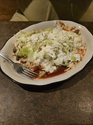 -Enchilada trio featured drained dry beef wrapped in Luke warm corn shells, made with canned aluminum-tasting sauce