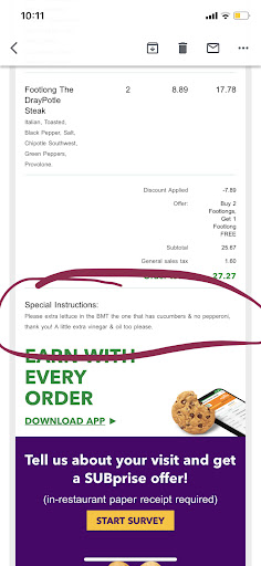 I was unable to respond to the owner, I also called to ask to speak to the manager & gave my name along with my call back number. Itâs been a week now & I have not received a call back from the manager. Yes, I know what I ordered but if you look correctly on âspecial instructionsâ part & itâs listed on top of the recite (which I donât have anymore nor did I take a picture of it), it clearly states Please extra lettuce on the BMT with cucumbers & no pepperoni & a little more vinegar & oil. The second BMT does not have cucumbers & it also says âless lettuce.â If I wasnât on bed rest Iâd go watch my sandwich be made so I could have my little bit of extra lettuce & the wheat bread not the white. Thank you for the response, I hope next time my order will be made correct &...