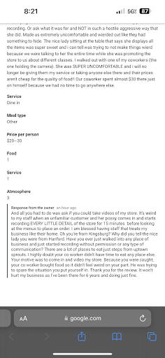 I came here with my two friends during my lunch and I handed my little vlogging camera to one of my friends who was there with me. When she was recording the beautiful atmosphere, there was one worker there who was so sweet, and she asked us where we were from. I told her from Hanford, because I personally was. We all complimented her on how beautiful and cute the store was. She didn’t seem to have an issue with any of the recording that was going on. Then the lady at the counter did seem to get shaken and a bit hostile about why we were recording. I understand that this can be jarring, but I know that there are better ways to handle these types of things. The lady at the counter did apologize, however it still made my friends feel very uncomfortable and unwelcome, which is why they left. I personally didn’t have much time left to choose a place to eat so I ordered there. My friend left a review stating how uncomfortable she was, which was only met with even more passive aggressive responses from the manager. This is really unfortunate because it goes to show the type of person that runs this place. It really is beautiful, but it seems some members of staff (more specifically the manager) has poor skills in managing the way they handle things like this at least from what I’ve seen. It felt as though the manager was putting the cashier in an extremely uncomfortable position too. Overall, I will say I admire the lady in the lobby’s work and how sweet and comforting she was, I appreciate the sandwich, but the way this was handled from the manager was very poor and weird, and then the response to my friends review was just embarrassing. Like watching a but hurt teenager respond in essay format. I can’t really recommend this place to anyone now, I used to love buying honey related items from here, but knowing how the owner thinks and responds is strange and uncomfortable. I wish those two ladies the best but I hope the manager learns to leave their bizarre behavior in the past, and handles situations like this in a way that doesn’t make everyone uncomfortable. Unfortunately, the managers response to my friends review alone is why I had to leave 1 star, on top of what had already happened. Someone who responds like that is truly hopeless to try and converse with about an...
