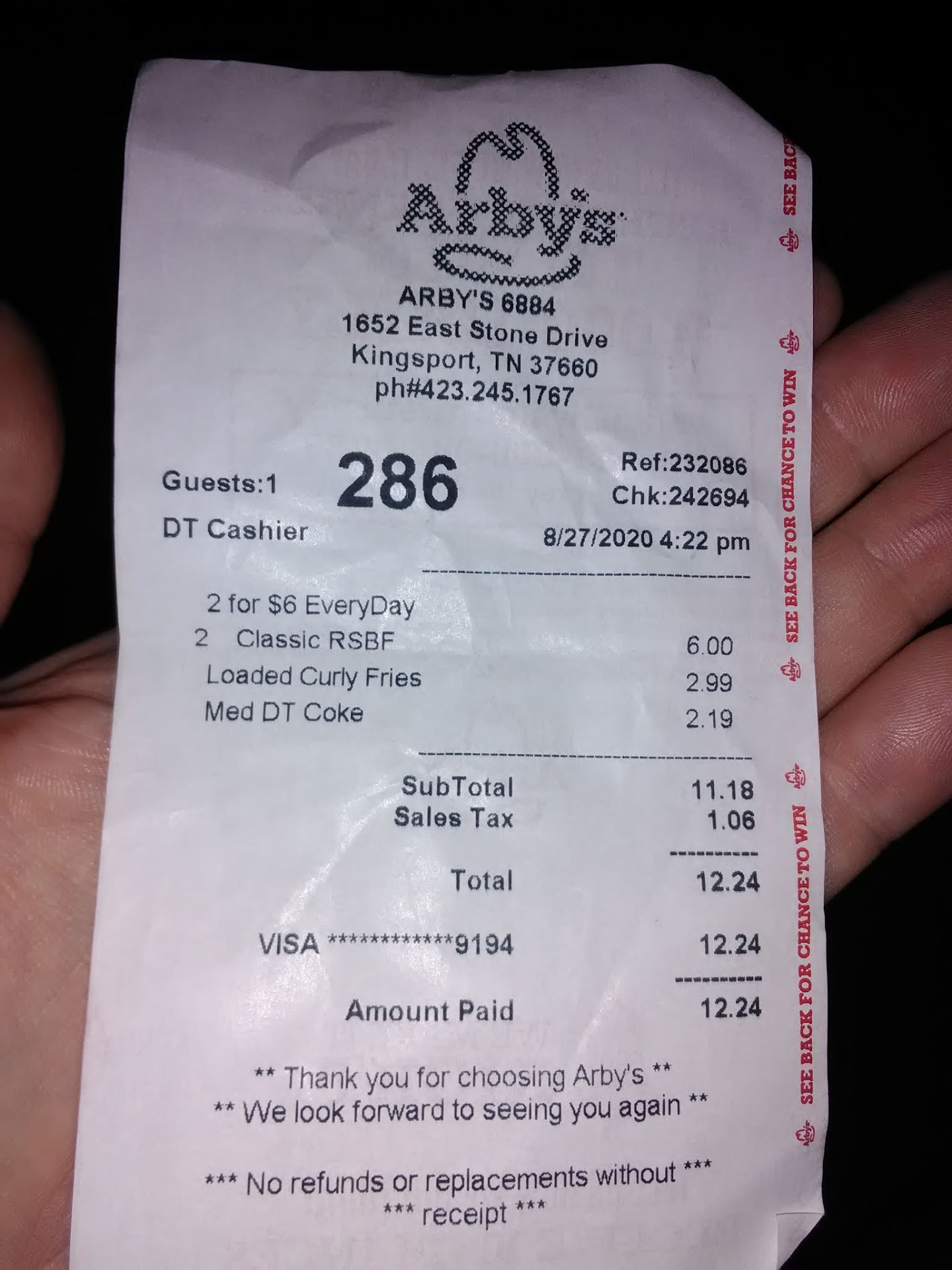 We stopped by Arby's on Stone drive in kingsport last evening to get some sandwiches. The lobby was lit and the door unlocked so we went in and were immediately stopped by three different employees telling us that the dinning room was closed because they were short staffed and seemed to be angry that we had walked inside . We were then told that we could drive around and order so upon driving around the building we came across three of their employees outside with their headsets on hanging around a vehicle talking and smoking cigarettes so we were able to see for ourselves just why they were short handed however we still don't understand why the other employees came at us the way they did. It wasn't our fault that half of their crew was hanging out outside and not inside doing their job's. We spent over 50.00 and when we got home with our food the curley fries were so hard from being over cooked that we couldn't eat them so that ended up being 12 to 15 dollars wasted on those. It was just an all around bad experience for us at this particular location. I think it will be awhile before we visit this restaurant again maybe they will hire some better help that knows how to treat...