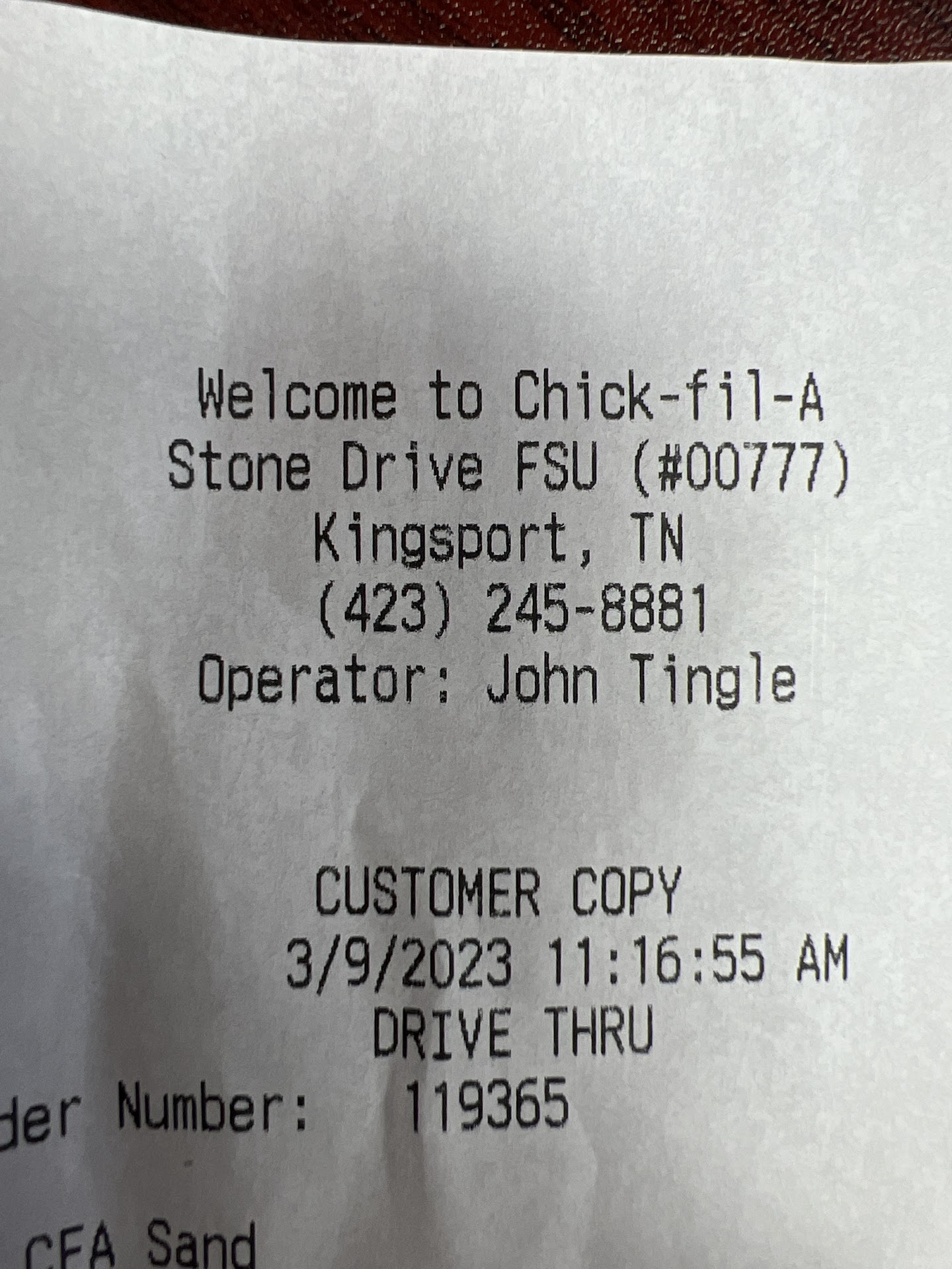 Read moreMy wife put in an order this morning to pick up some breakfast on the chic fil a one app. ordered our food and they said that we had 12 minutes to be there because breakfast is stopped at 10:30. We arrive to chic fil a at 10:15 and there is no where to pull into the parking lot and the line is wrapped around the building as normal. We are unable to tell them a parking space location because you cant even enter the parking lot. We call the store and because we are unable to get into the parking lot the manager names CARTER tell us that we can park at IHOP which is next door, But on their app it doesn't say anything about being able to park at IHOP and pick up your food. So Chic-Fil-A cancels our order and we dont recieve our food because we can not enter the restaurant because they have the doors locked. All they offer us is some lousy coupons which does nothing for the fact that im hungry now. The Customer service at this facility is very poor and needs to be address. Chic Fil A prides its self on good customer service and you cant even open the dining room to let people come inside and pick up your order when every other restaurant in the Tri Cities is open is really sad. Totally shows how they do not care about their customers at...