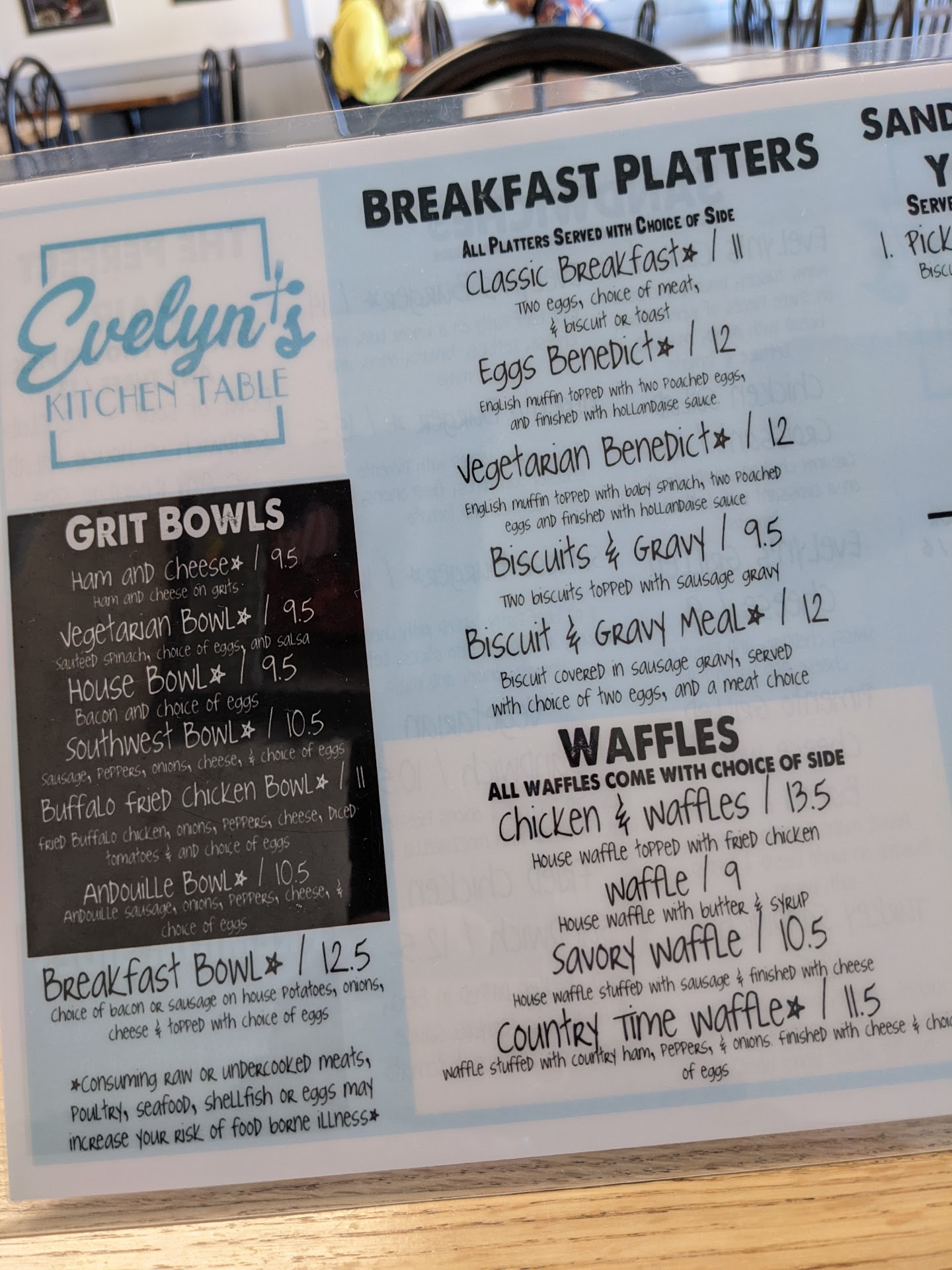Read moreI have mixed feelings about this place. A coworker and I went there for lunch yesterday to try it. I'll give you the good first, then the not-so-good. The good things are the place was very clean, we were greeted and seated very quickly, and the hostess as well as our waitress was very friendly. Our food came out in a reasonable time, and was proper temperature, and presented well. The food was pretty good. Not great, but certainly not bad. Now for the not-so-good. With a name like Evelyn's Kitchen Table, we believed we were going to a place that offered home cooking options and not just sandwiches. What we thought we would get was a blue plate style lunch, such as meatloaf and mashed potatoes, fried chicken and macaroni and cheese, etc. They don't offer that kind of thing at all. They offer breakfast during all business hours, and other than that, it's sandwiches, soup, or salad. They also do not offer dessert apparently, as we didn't see anything on the menu, and none was offered. The most not-so-good thing was the price. My coworker got 1/2 sandwich, soup, and Coke, and I got a grilled cheese, home fries, and tea, and the bill was over $25 plus tip! If they don't expand their menu, or at least lower their prices to charge more reasonable amount, I don't believe...