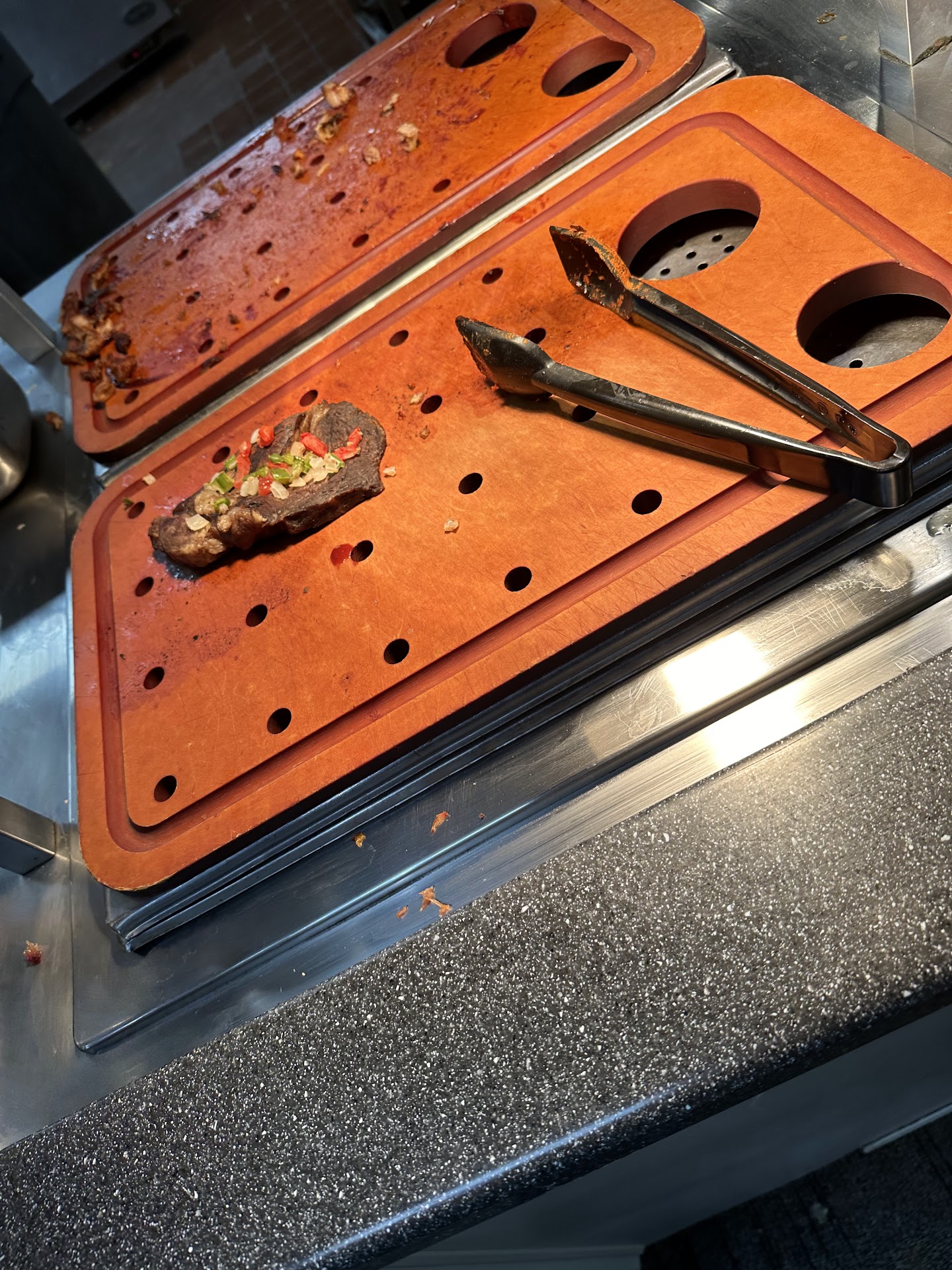 Now the issues we did find was a bit...off To start off, some of the food was interesting and needed some work, I forgot if it was pumpkin or sweet potato pie, but it had way too much cinnamon that you couldn't enjoy the flavors this pie had to offer. The mango ice was nothing but colored water, and the banana pudding was bland. The steaks needed better trimming, and it was warm, I had asked for a rare, and he had taken the steak that had been sitting beside him and tossed it on the grill to warm it up. The bathrooms, both male and female, had issues. The males restroom was nasty and filled the room with an aroma where it made you not want to eat when you returned. And in the female bathroom , a worker with an apron had walked out of the handy cap while a handy cap female was waiting for it, and washed her hands and left. Any worker with an apron should remove the idea to prevent cross contamination. When we asked to speak to a manager, he was very nice and understood the situation and said he would have a talk with the servers.