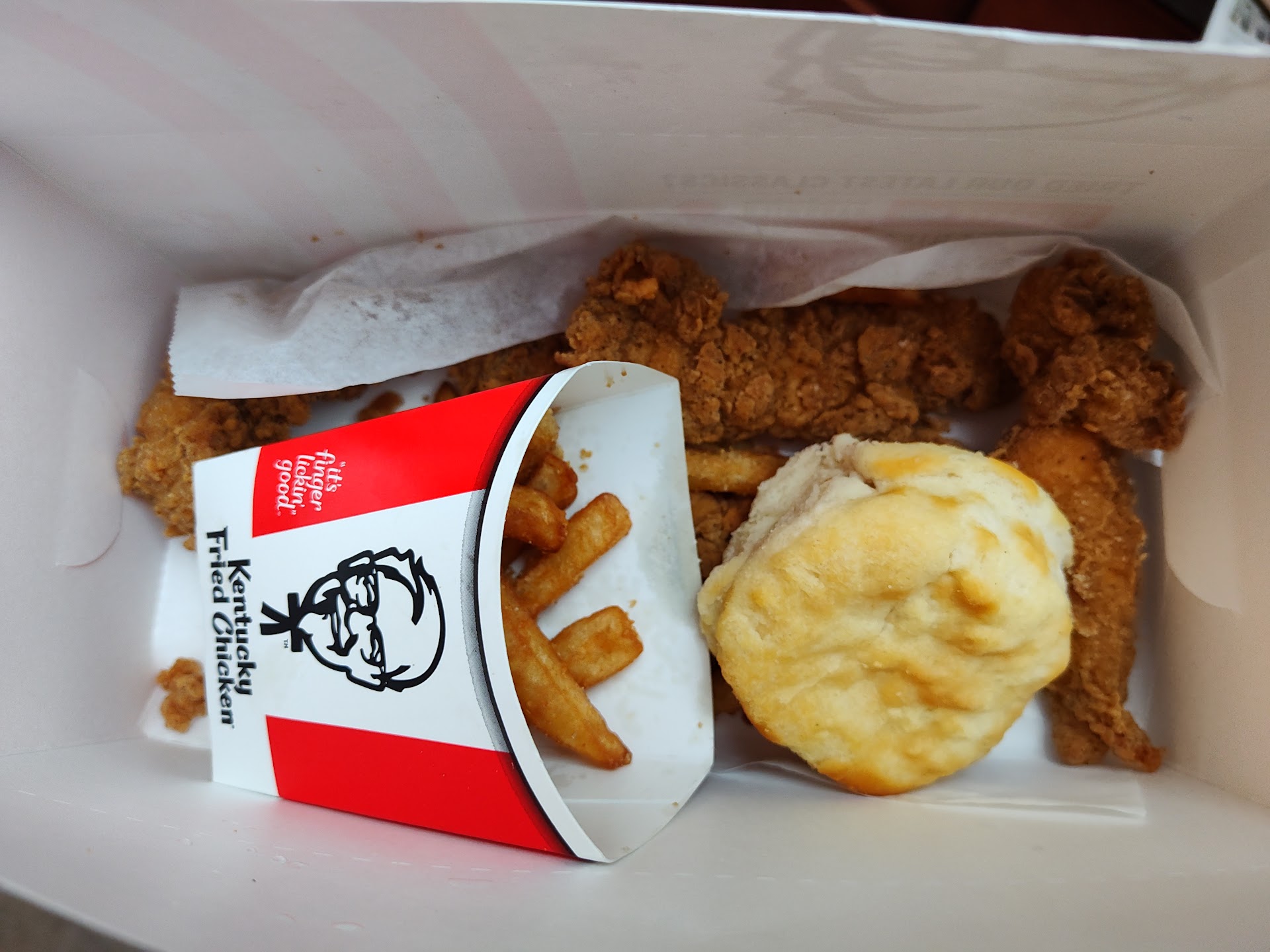 Read moreGot the $20 fill up..that isn't $20 anymore but I didn't know that they had four(4) different kinds of the $25+tax fill up now. So when I got to order told them I wanted the fill up & they Never asked me which bucket I wanted!! Never even said they're 4 different options to choose from now..when they've always been just one. So they give me what They wanted me to have & of course it wasn't the right one.....after I get home & log onto the website to tell them they only gave me a bucket of bones & no breast. That's when I find out that one of the options I Could have chosen.."if I knew about them'' was 4 breast 3 sides & 4 biscuits. & That IS What I would have taken if I'd known. The point is they didn't ask me which one I wanted so they assumed I wanted the bucket of bones no meat bucket...but I Assumed they Knew I wanted the 4breast bucket...but NOOO!!! Then also came straight home with it..bout 5-6mins top & the bucket of bones was as cold as the damn coleslaw...wth!! The biscuits you could bust a window out with & I have always loved them...even a couple days later. Not these...I didn't like these a couple mins later! And the chicken used to be so good...what the hell happened there??? What little bite of meat I got tasted like frog meat & the rest was bones! Very unsatisfied with the Service...for Not letting me know they changed the menu & not ask which bucket I wanted...and the food... I wouldn't even give the bones to my dog. Last time I'll be back there...