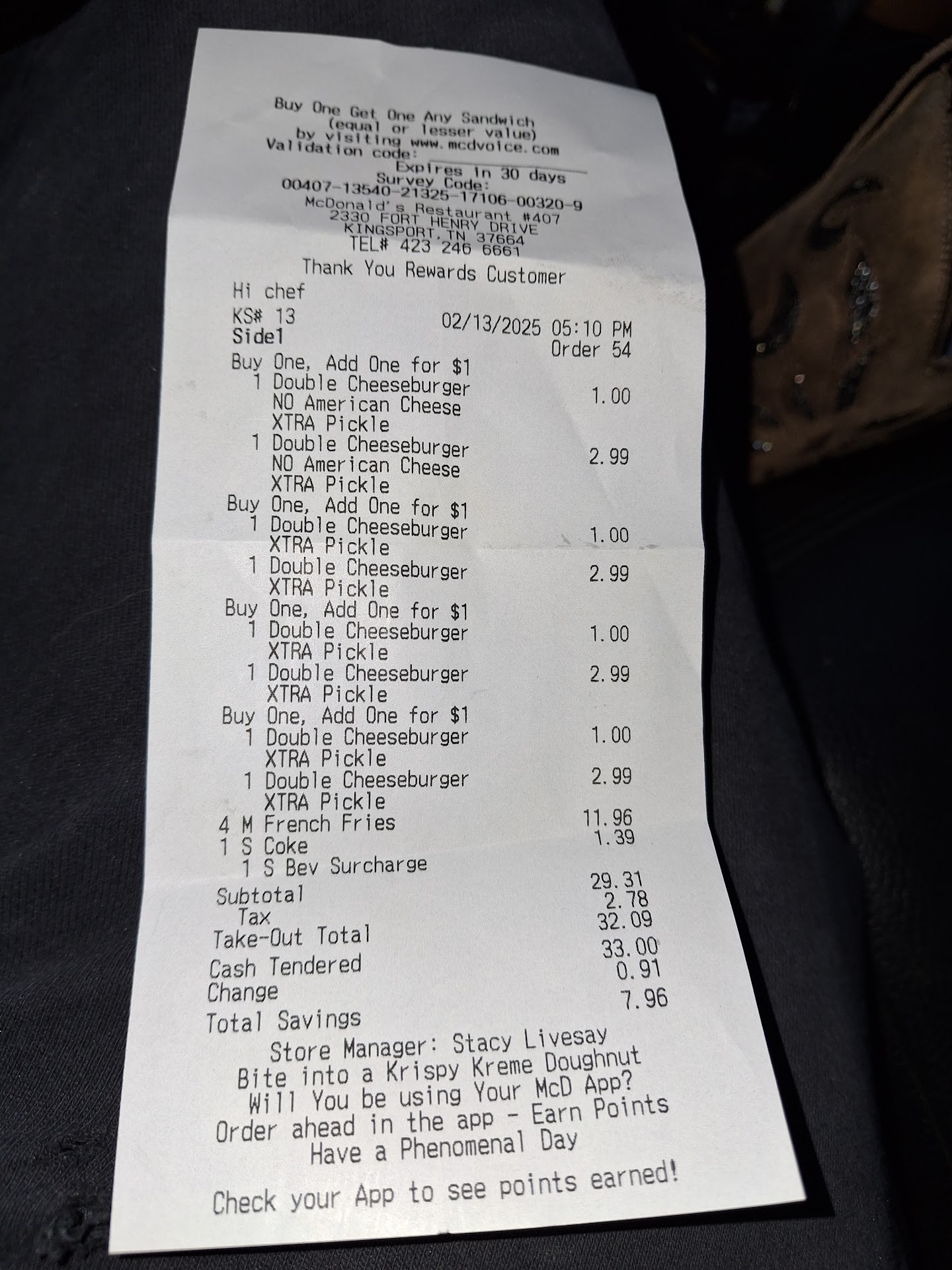Read moreMcDonald's needs cleaner stores, way, way cleaner more respectful employees, they let a homeless guy who out of his own words had not taken a shower in three months work in the kitchen hidden in the back long dirt filled nails nasty hands and hair, never once washed uniform. ...he was an IV user with hep c for Christ sakes he never washed his hands had abscesses and blood on his skin from being a dirty IV user, it just really grouse that they had him for a year daily making food their and i let him sleep in my car and guest house trying to be a good guy , either way there is no way they didn't notice I wld Beg the guy to shower and be clean about things and after he stayed in guest house and car I had to littwrly throw away furniture from the smell of him just setting on it after a week of cleaning them and still smelling like this guy did it was horrible ugh they need to be reported and I should get compensation for my health risk I have anorexia and an auto immune deasise I about will not ever use McDonald's again their nuggets are way too expensive anyway and as a pesko vegeterain and someone with an eating disorder. And health problems deserve better options their cheap 1$ chicken is prosseced covered in slop and grease and its just they should offer better options for us with health problems and others who want to be healthy for less money I can barely ever afford 6$ nuggets and burger king and Wendy's has 20 peices for half that or less 3$ ,also their café coffee and smoothies are 3/5$ a piece that...