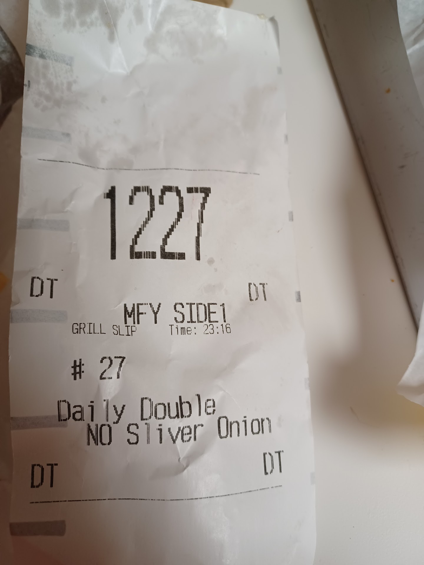 However when I got bk to their house and gave out the food , checked mine, it was wrong and looked awful. It was a McDble, not a Daily Double (which is supposed to come only with cheese, mayo, lettuce, tomato & onion). This 1 didn't have onion (yay) or tomato (boo) but also had must& ketchup, pickles and very little lettuce 🙄. I was very disappointed& hungry! 🥺😠 I took pics. Also called back again, Cassidy was off so I spoke to the guy now on duty and explained what happened. He sd to come back now with the receipt, bring food back and he would remake it. I sd "I can't now, I'm hungry and I've been out in the rain, running errands and then there (and bk home 20min and it's 20min back there and 20min back home) and was looking forward to eating 2 burgers made correctly! Plus, I'm packing to leave tomorrow. I just want a refund now". He sd then come next evg, he'll be there at 7 and he'd fix it right. I repeated that I'd planned to leave by 8am and they don't do burgers then. And they've had 2 chances to fix the burgers right and that's enough. So please write my name down with the info and I'll come get my refund!" And he hung up.